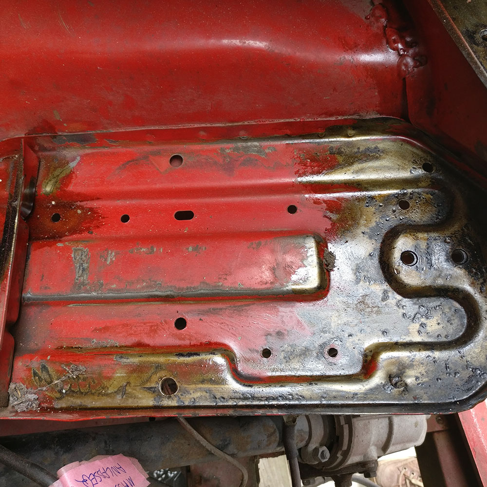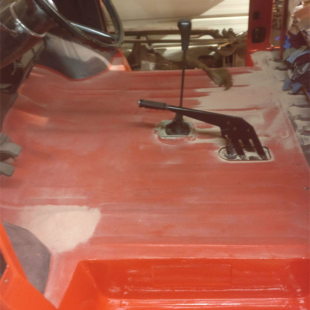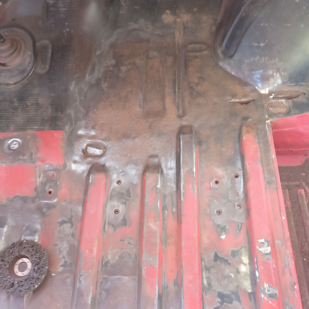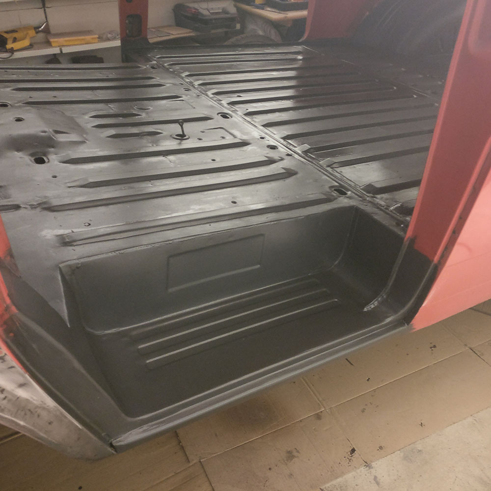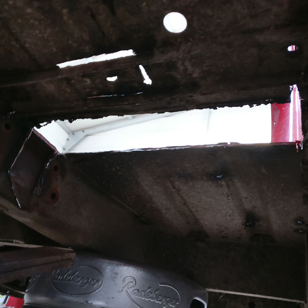 Nach dem kompletten Entrosten, schweißen aller Löcher und dem Schließen des alten Schaltdurchlasses, wurde in komplette Lackneuaufbau mit 2k-Grundierung und Rostschutzlack gestrichen und gerollt.