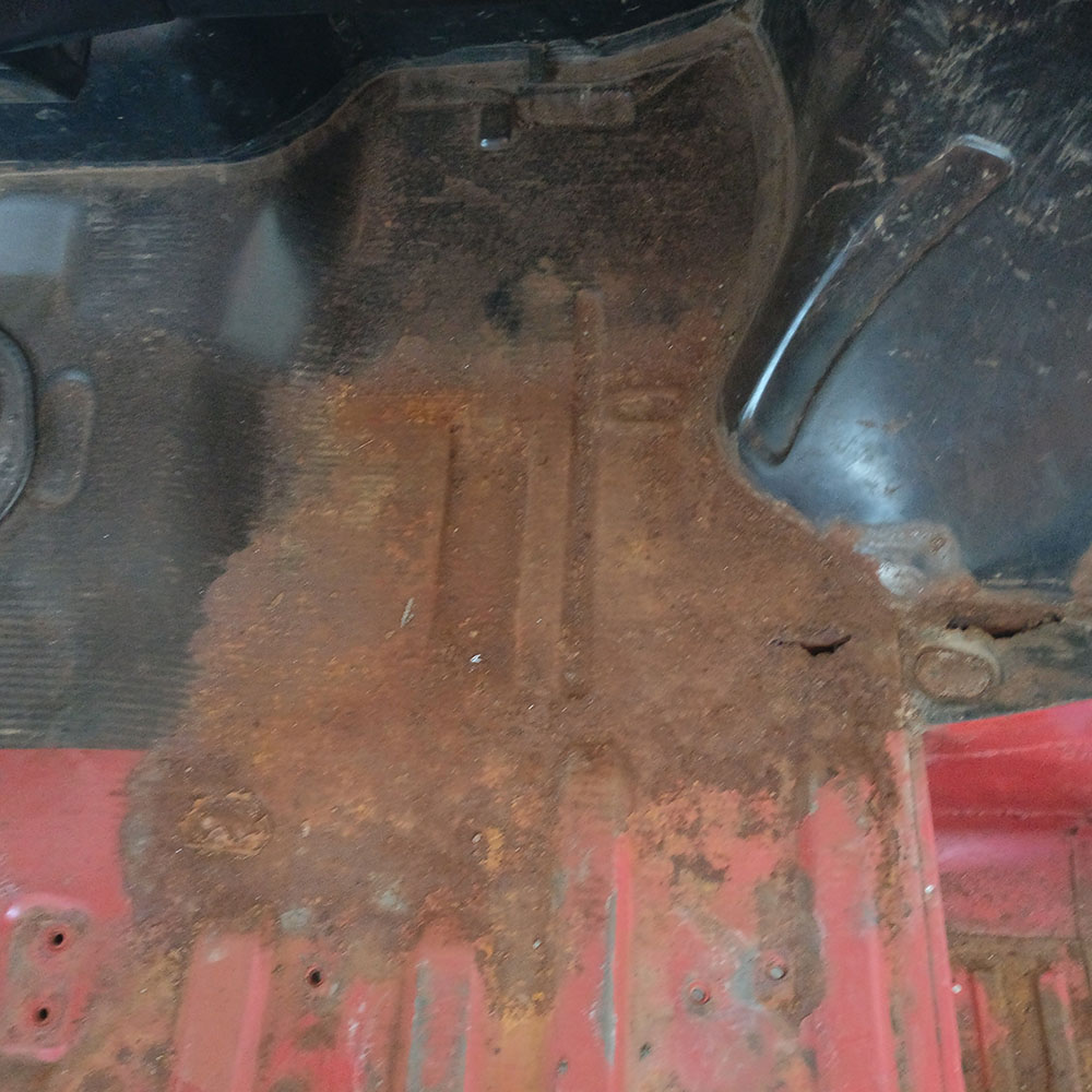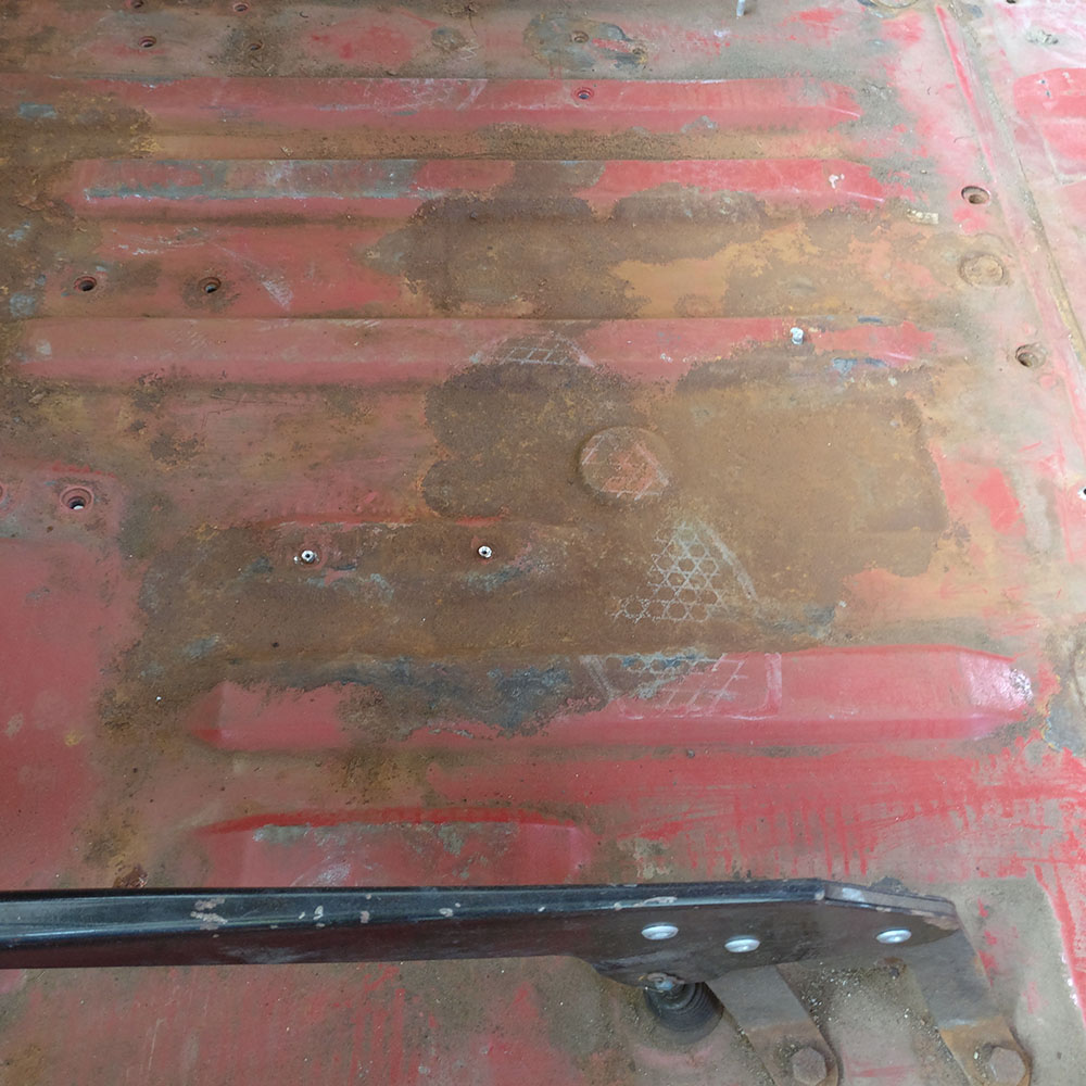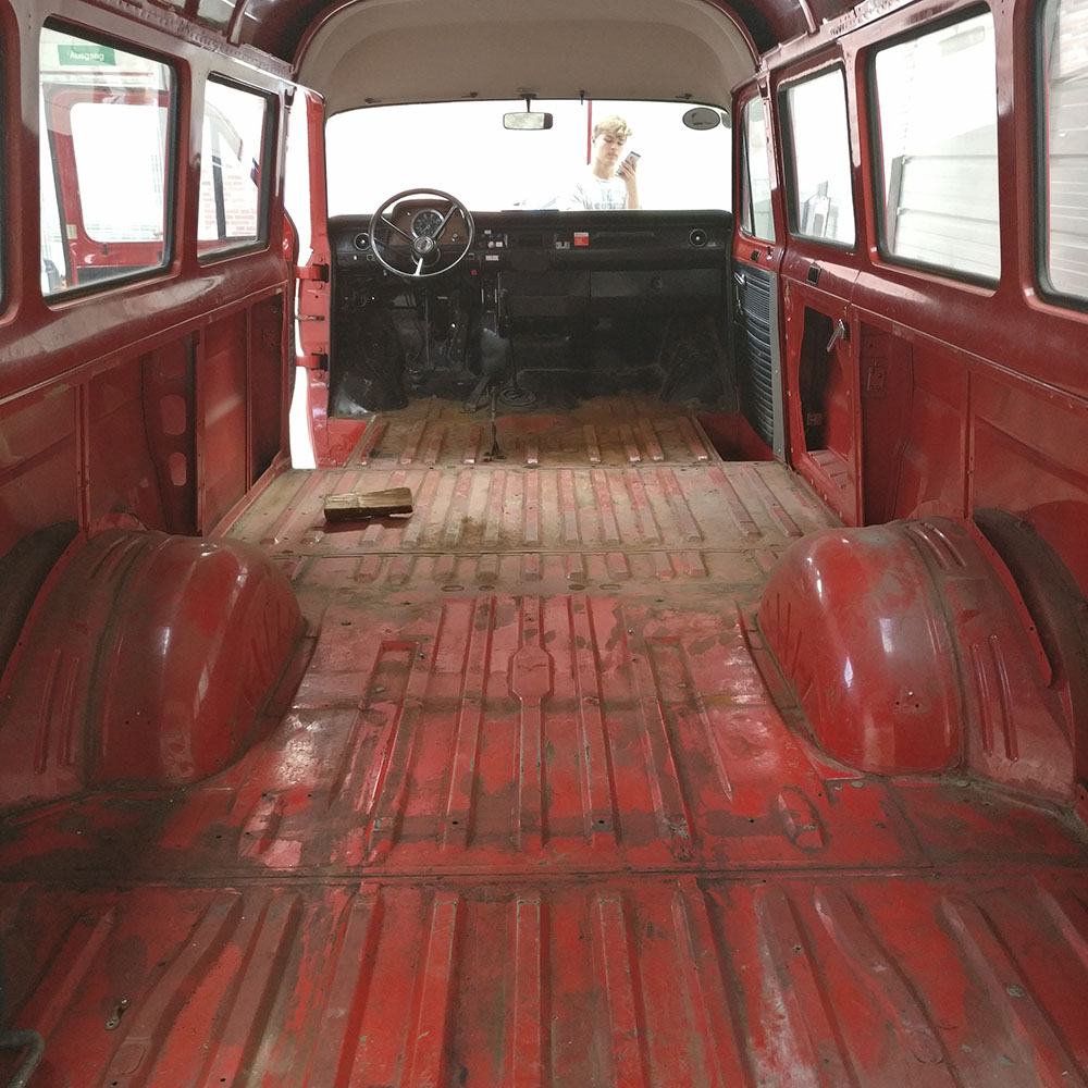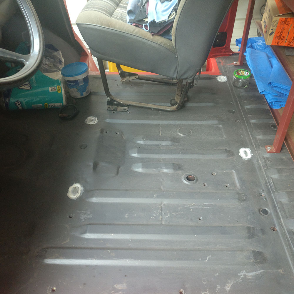 Nach dem kompletten Entrosten, schweißen aller Löcher und dem Schließen des alten Schaltdurchlasses, wurde in komplette Lackneuaufbau mit 2k-Grundierung und Rostschutzlack gestrichen und gerollt.
