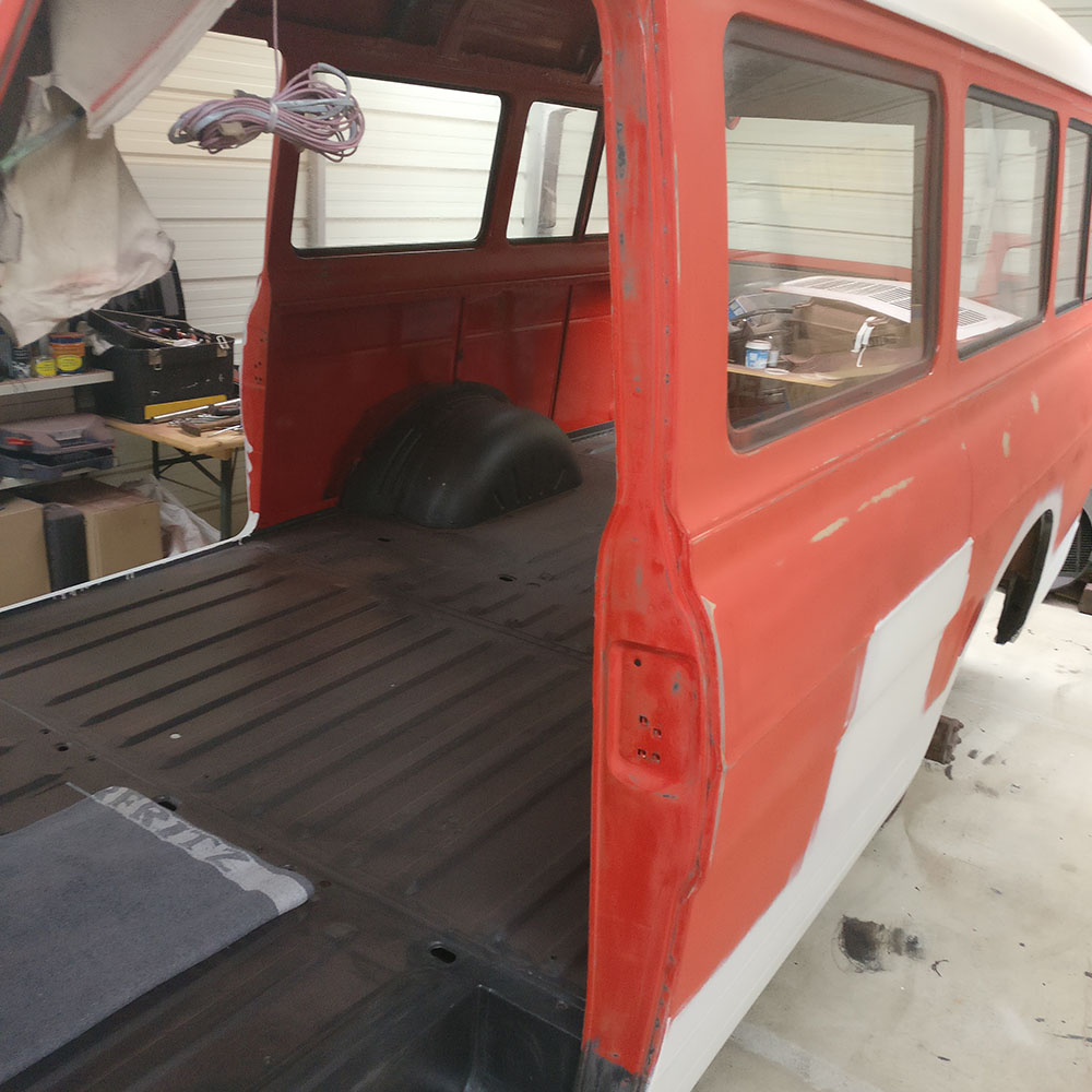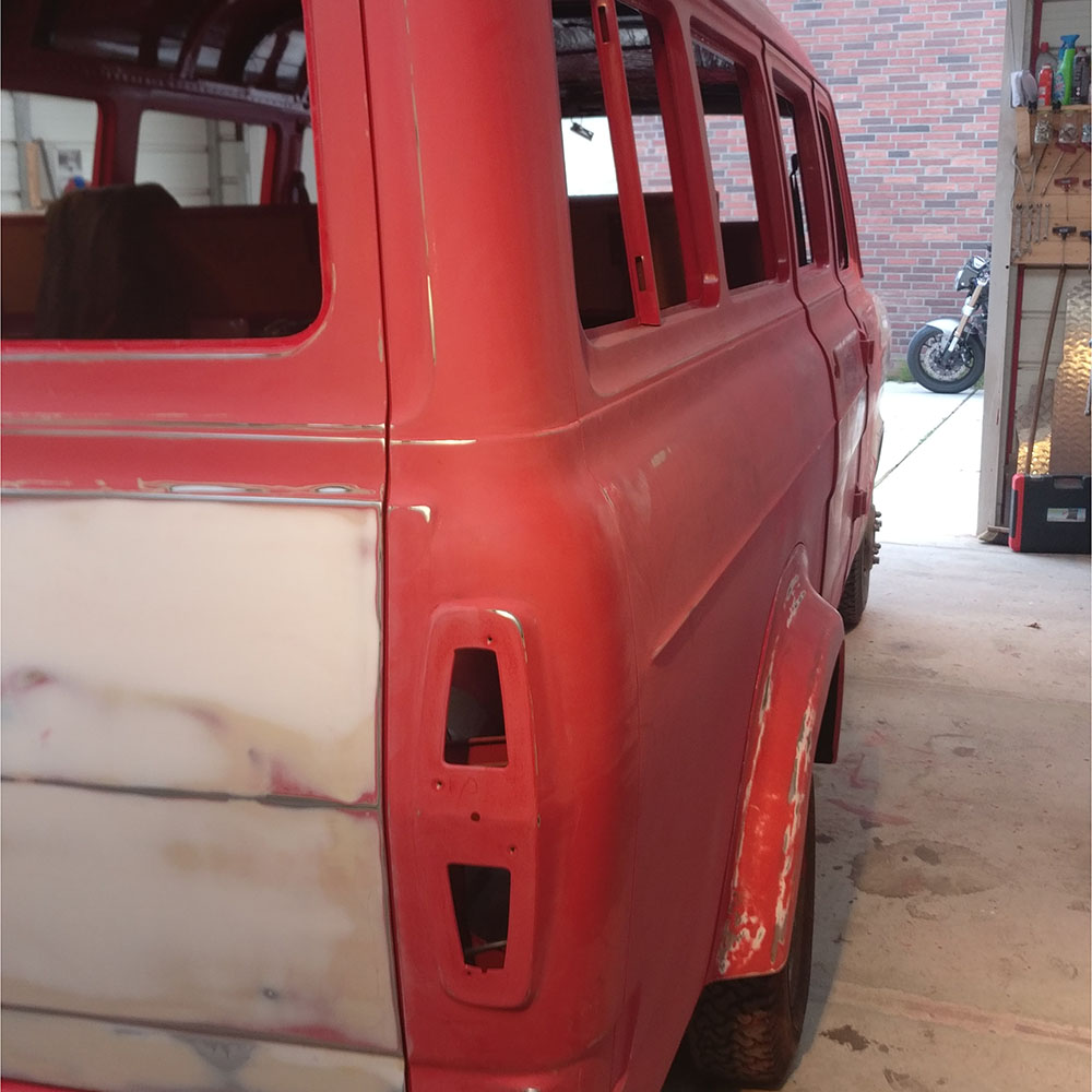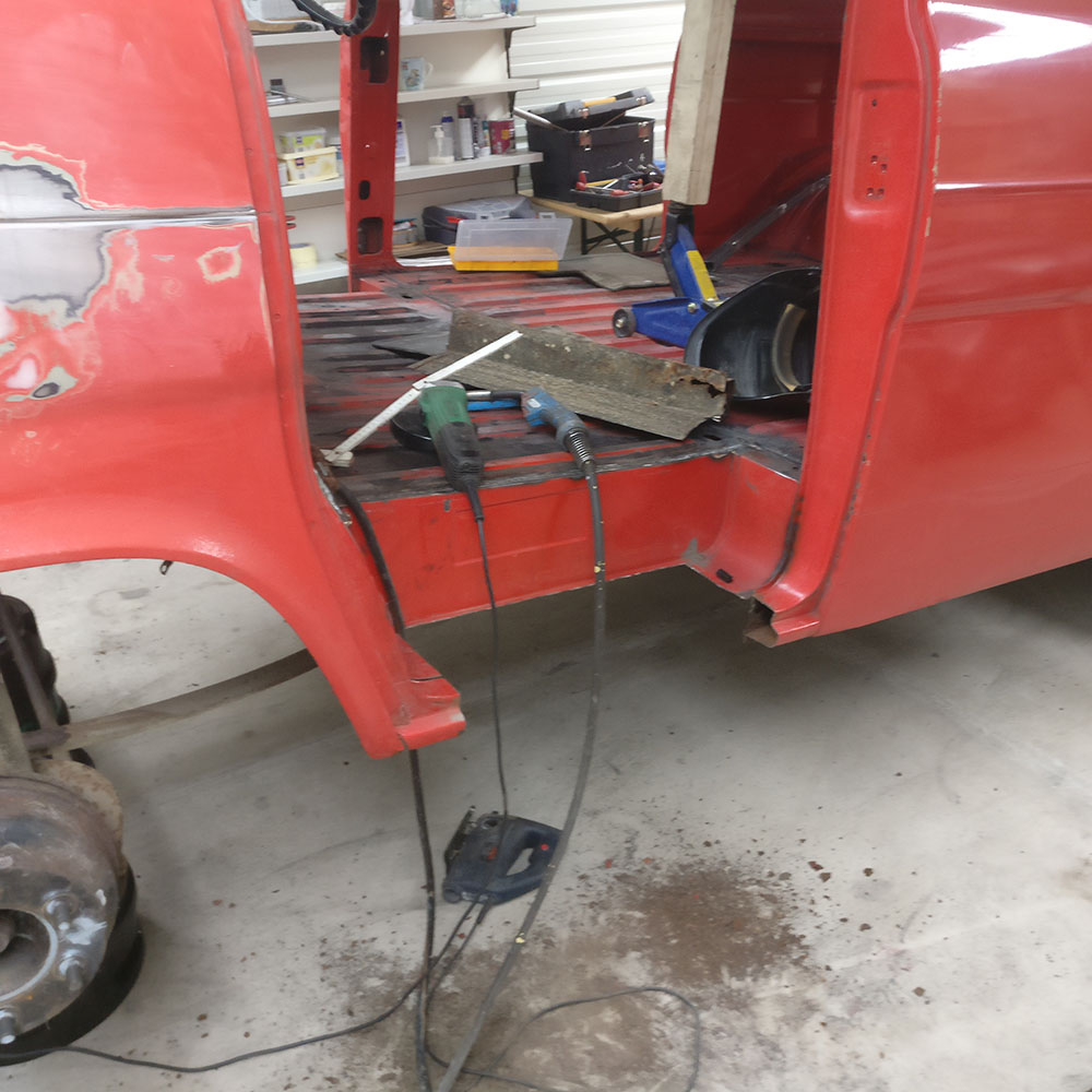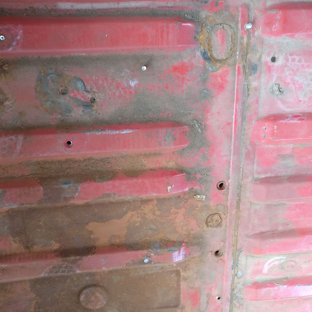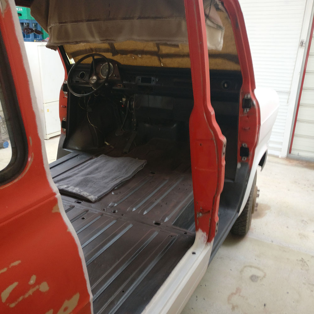 Nach dem kompletten Entrosten, schweißen aller Löcher und dem Schließen des alten Schaltdurchlasses, wurde in komplette Lackneuaufbau mit 2k-Grundierung und Rostschutzlack gestrichen und gerollt.