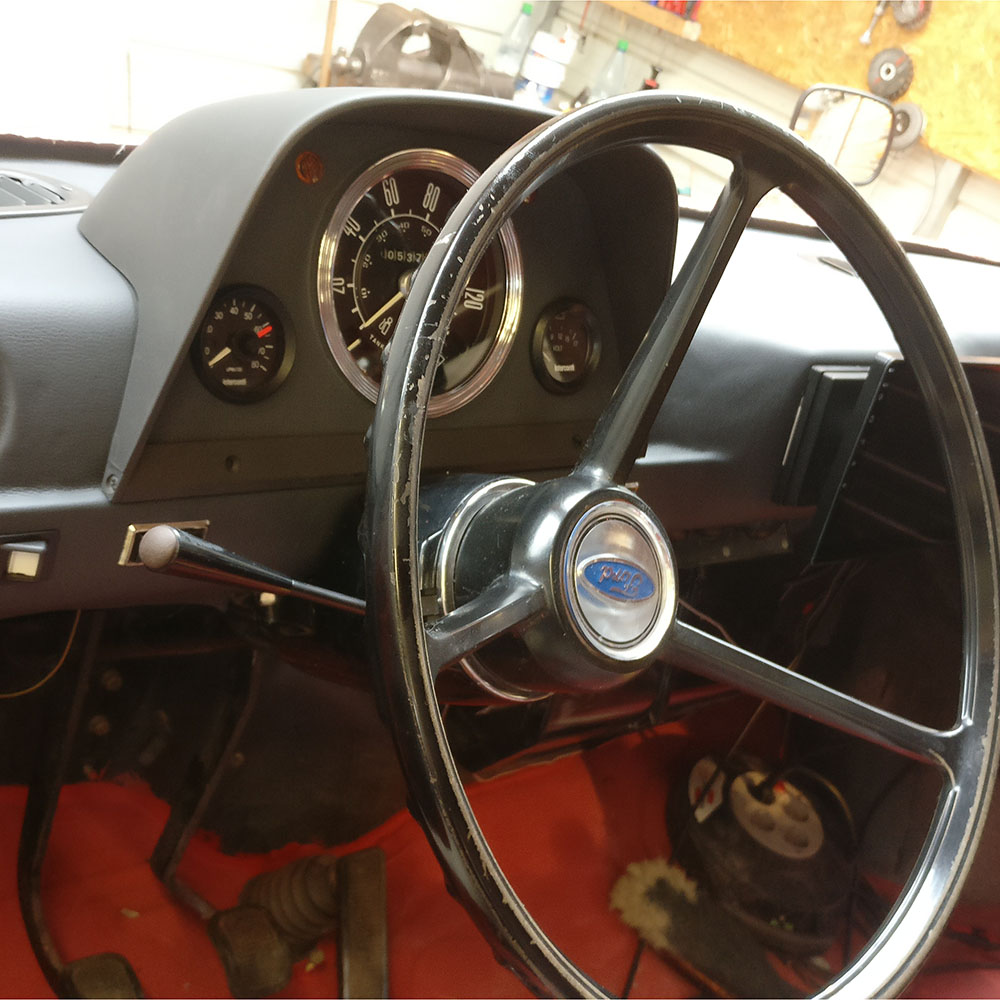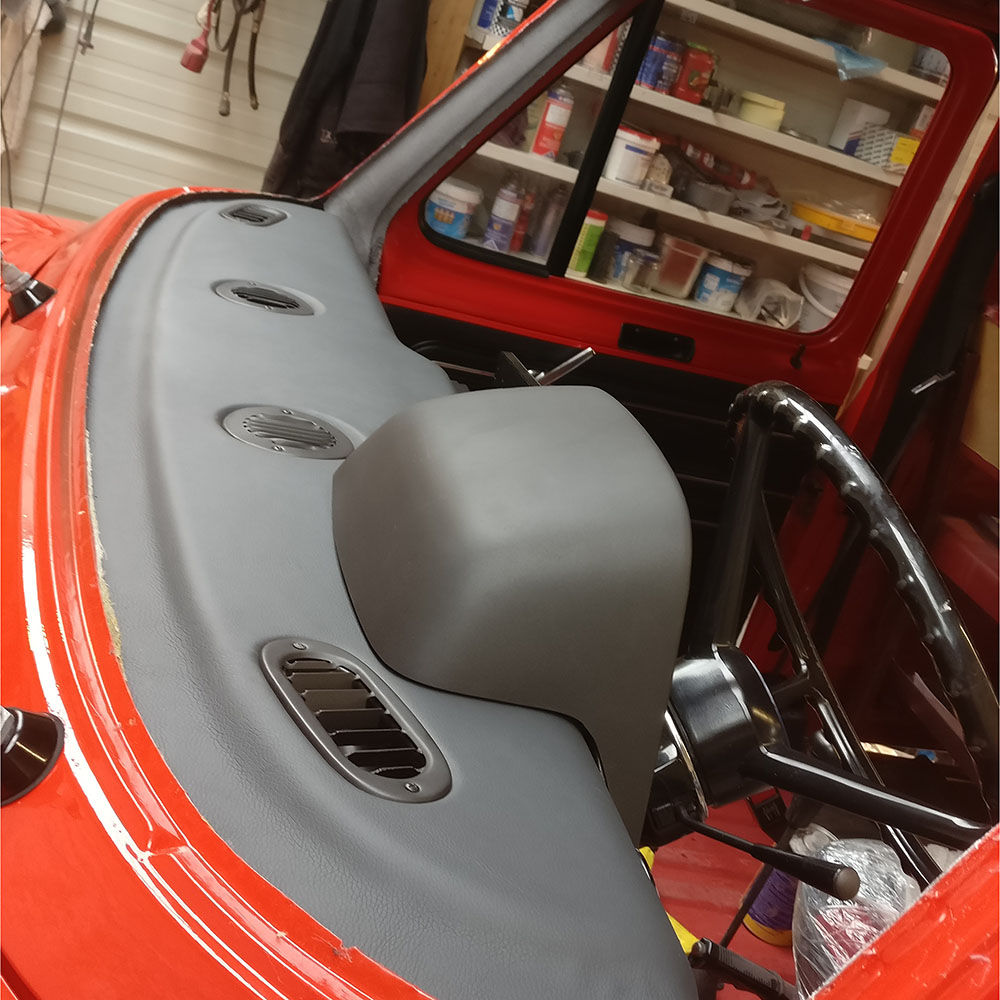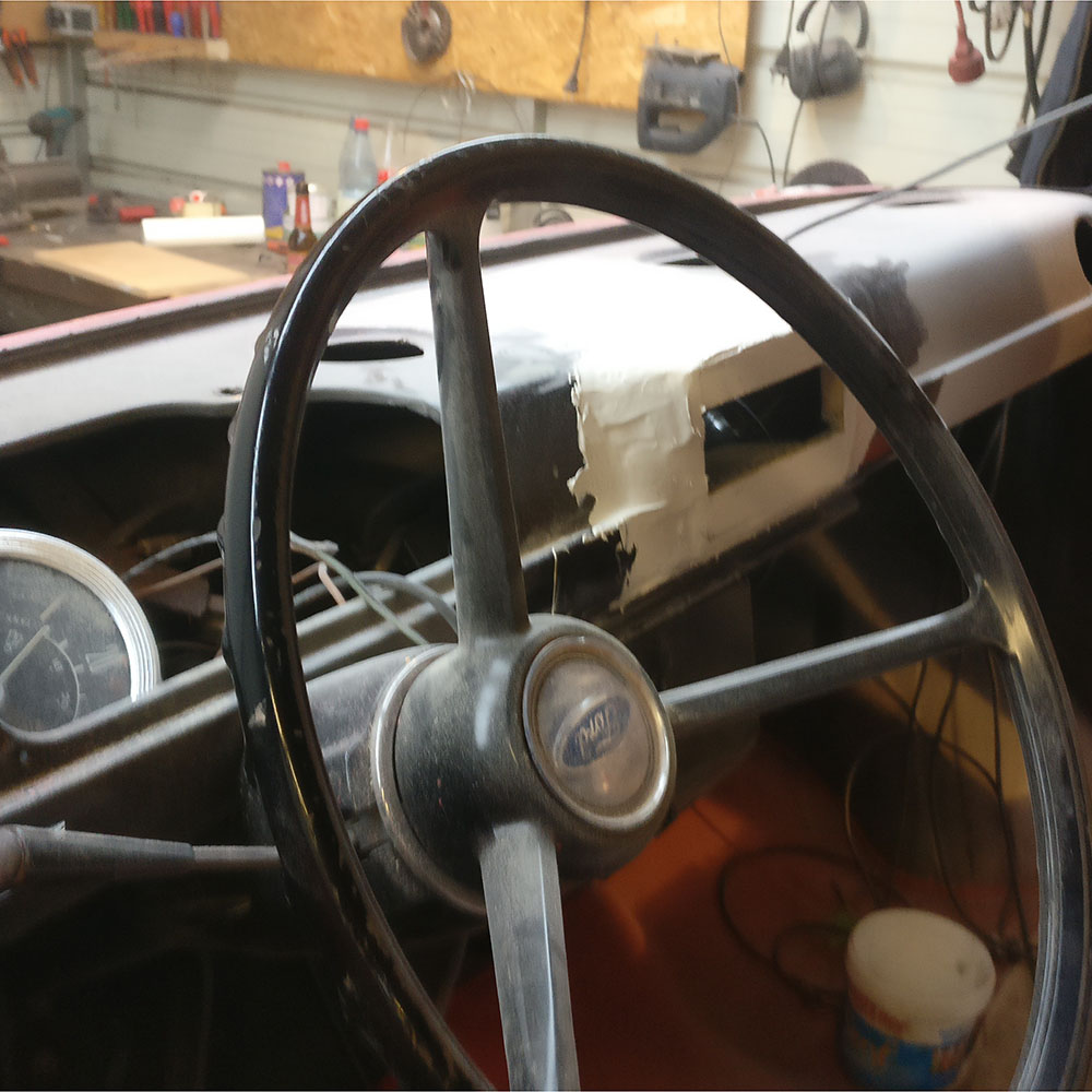 Das alte Armaturenbrett wird wieder in Form gebracht, die Löcher geschweißt, ein DIN Schacht für ein modernes Radio eingebaut und mit Kunstleder bezogen.