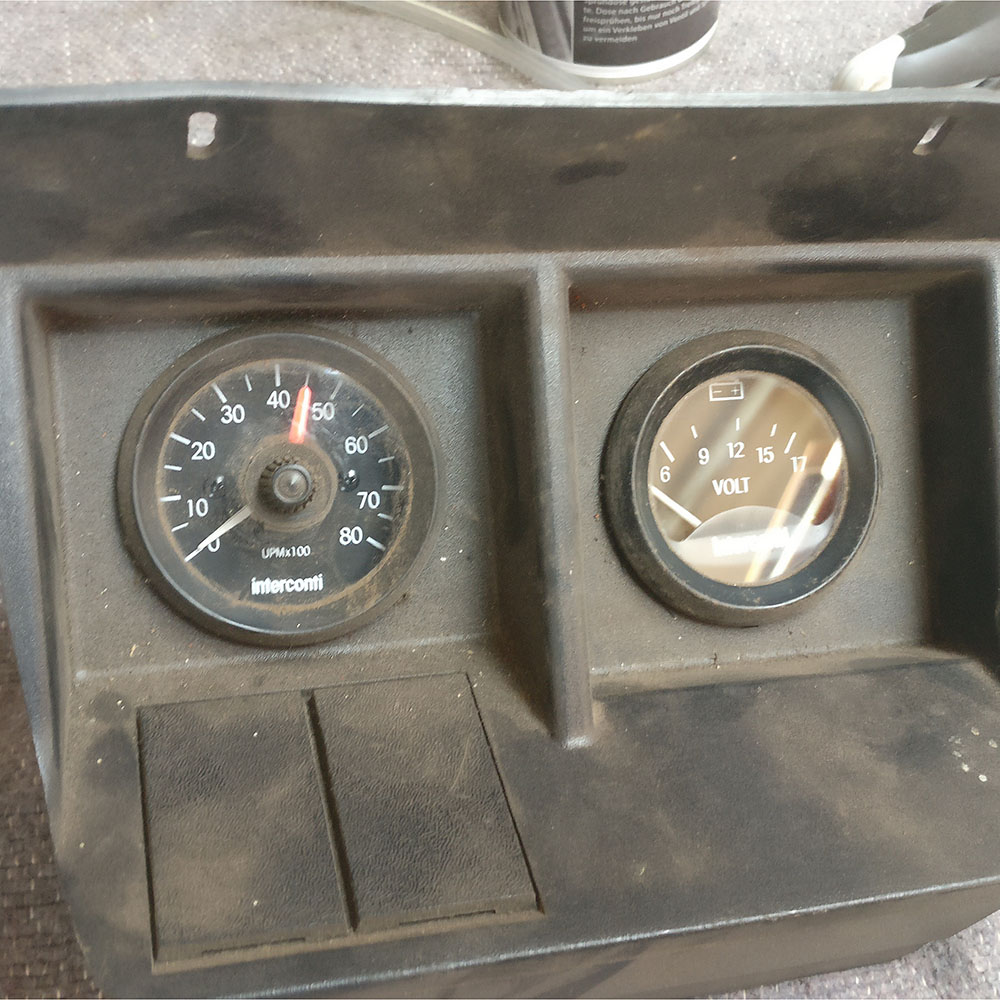 Frankie schenkt mir zwei alte VDO Zusatzinstrumente für Drehzahl und Spannung, die im renovierten Tachoboard Platz finden.