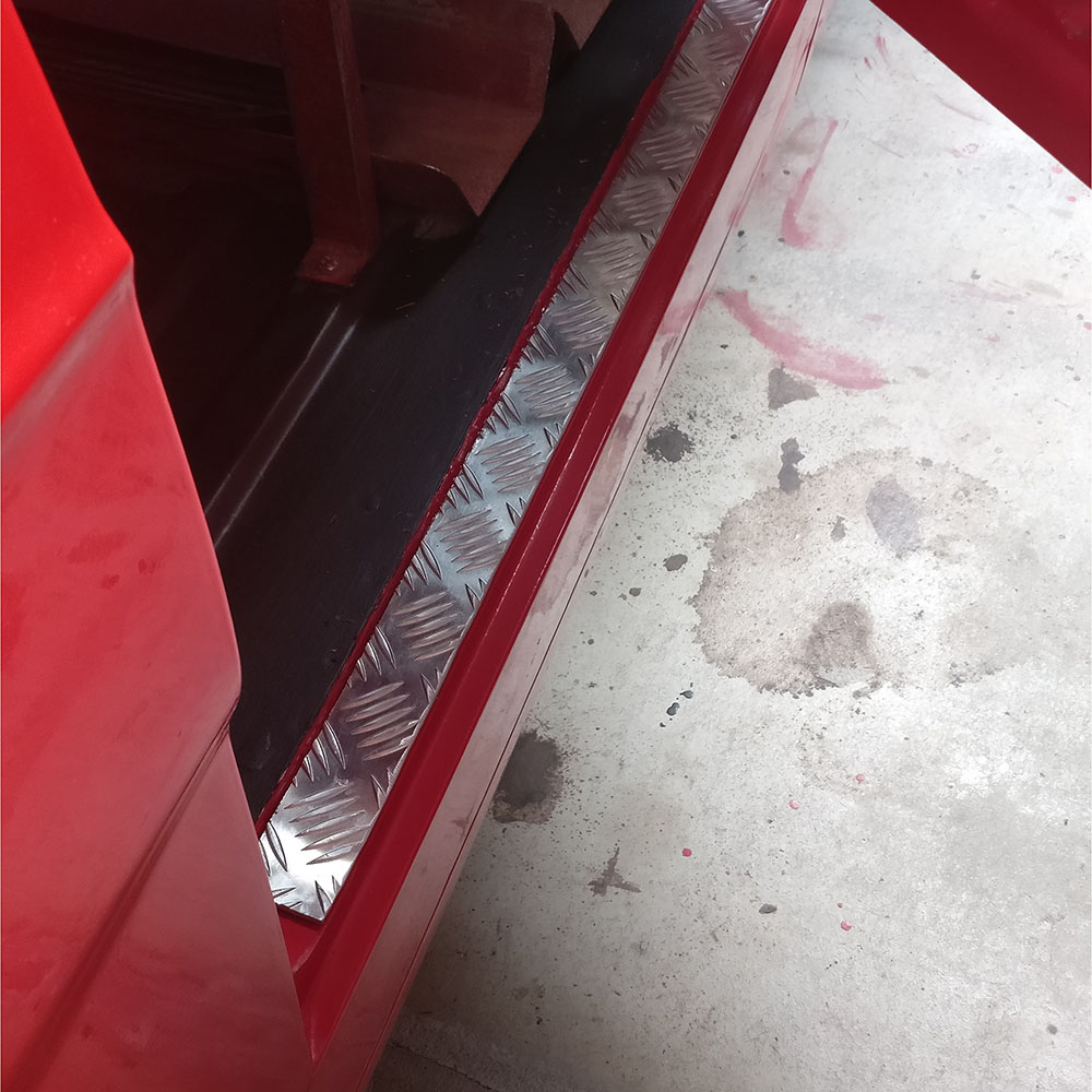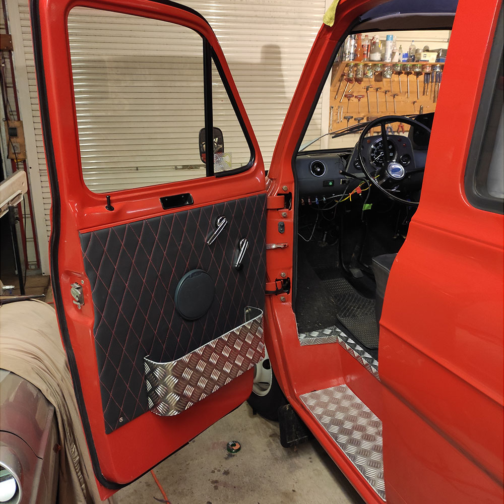 Die Türen bekommen neue Pappen und werden mit Kunstleder bezogen. In die Vordertüren werden Lautsprecher eingebaut. Zusätzlich entstehen neue Ablagen in den Türen und alle Einstiege und Kanten werden zum Schutz mit Alu-Riffelblech belegt.