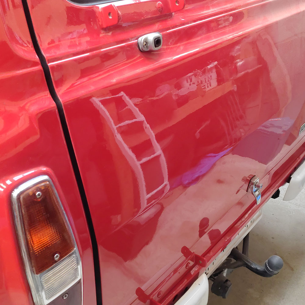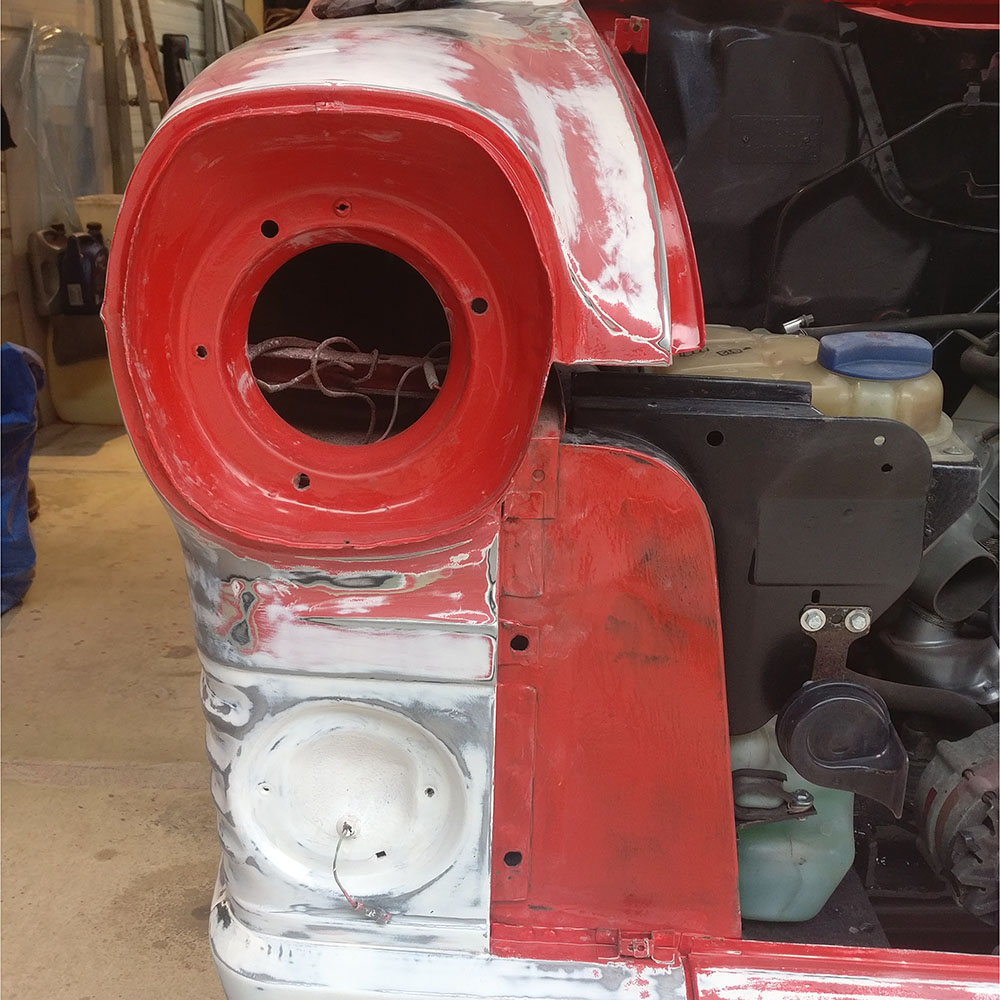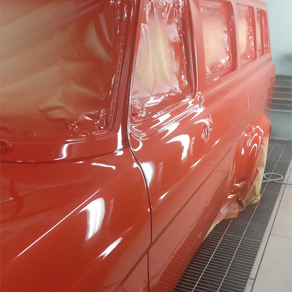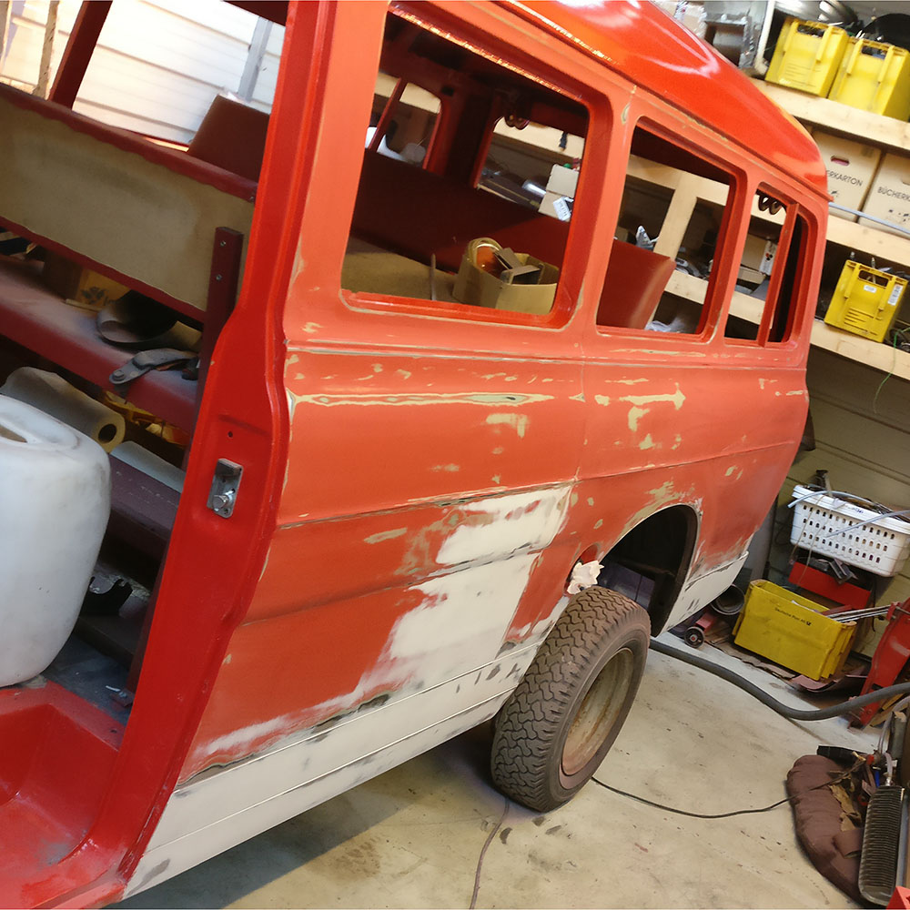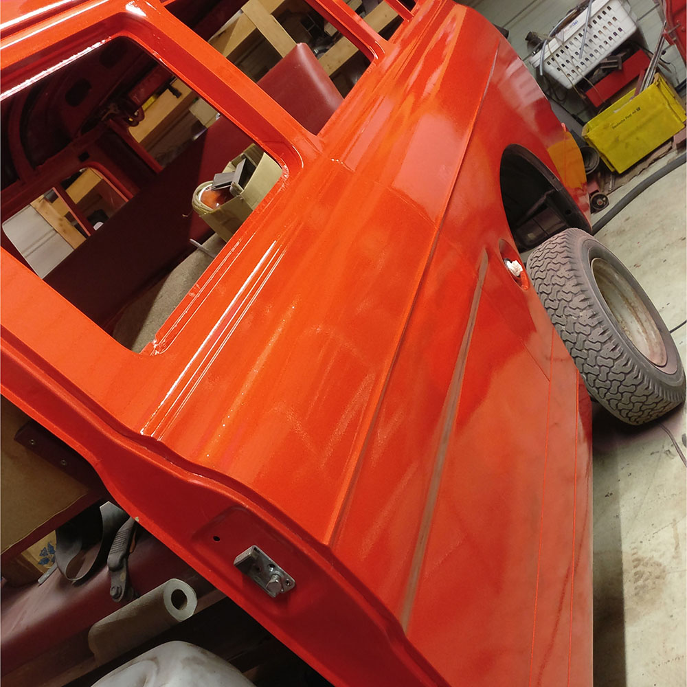 Am Ende haben wir dann wo nötig gespachtelt und mit 1200er Körnung durchgeschliffen, bevor das Auto zu Ali in die Lackiererei gekommen ist. Der hat dann den letzten Schliff gemacht und im original RAL 3000 „Feuerrot“ lackiert