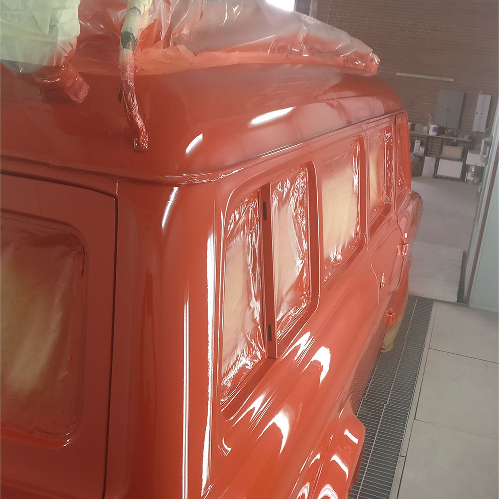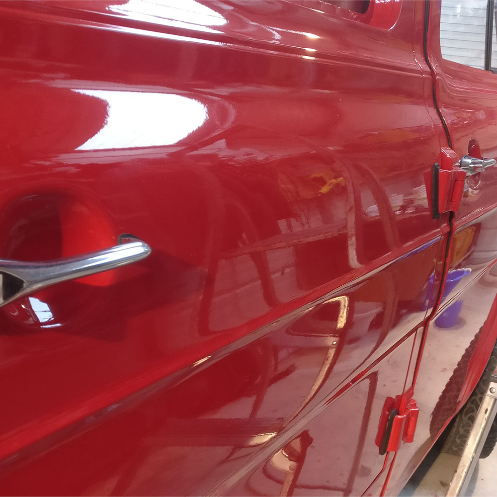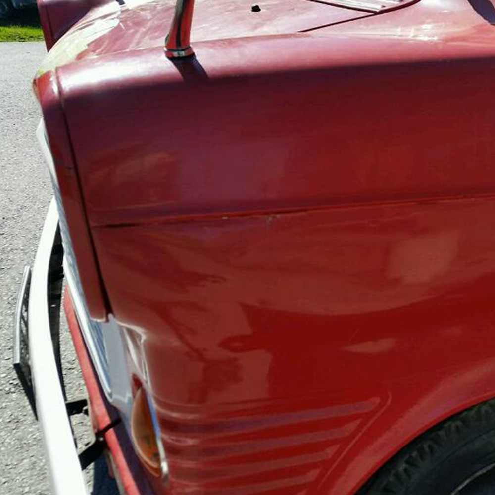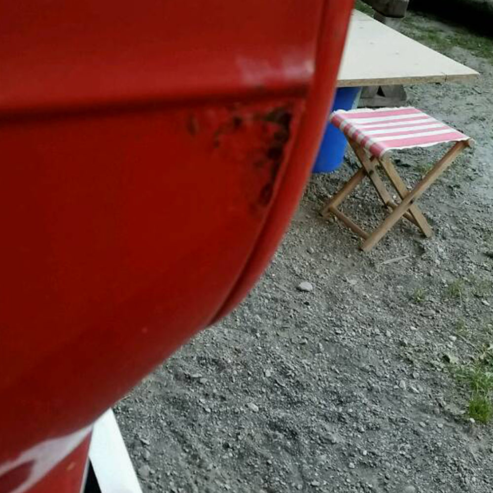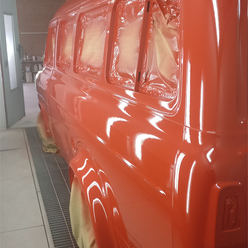 Am Ende haben wir dann wo nötig gespachtelt und mit 1200er Körnung durchgeschliffen, bevor das Auto zu Ali in die Lackiererei gekommen ist. Der hat dann den letzten Schliff gemacht und im original RAL 3000 „Feuerrot“ lackiert