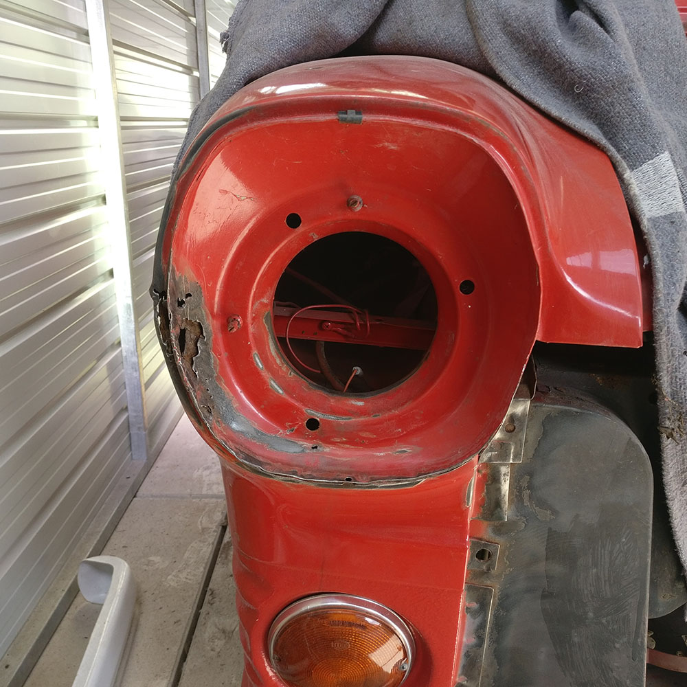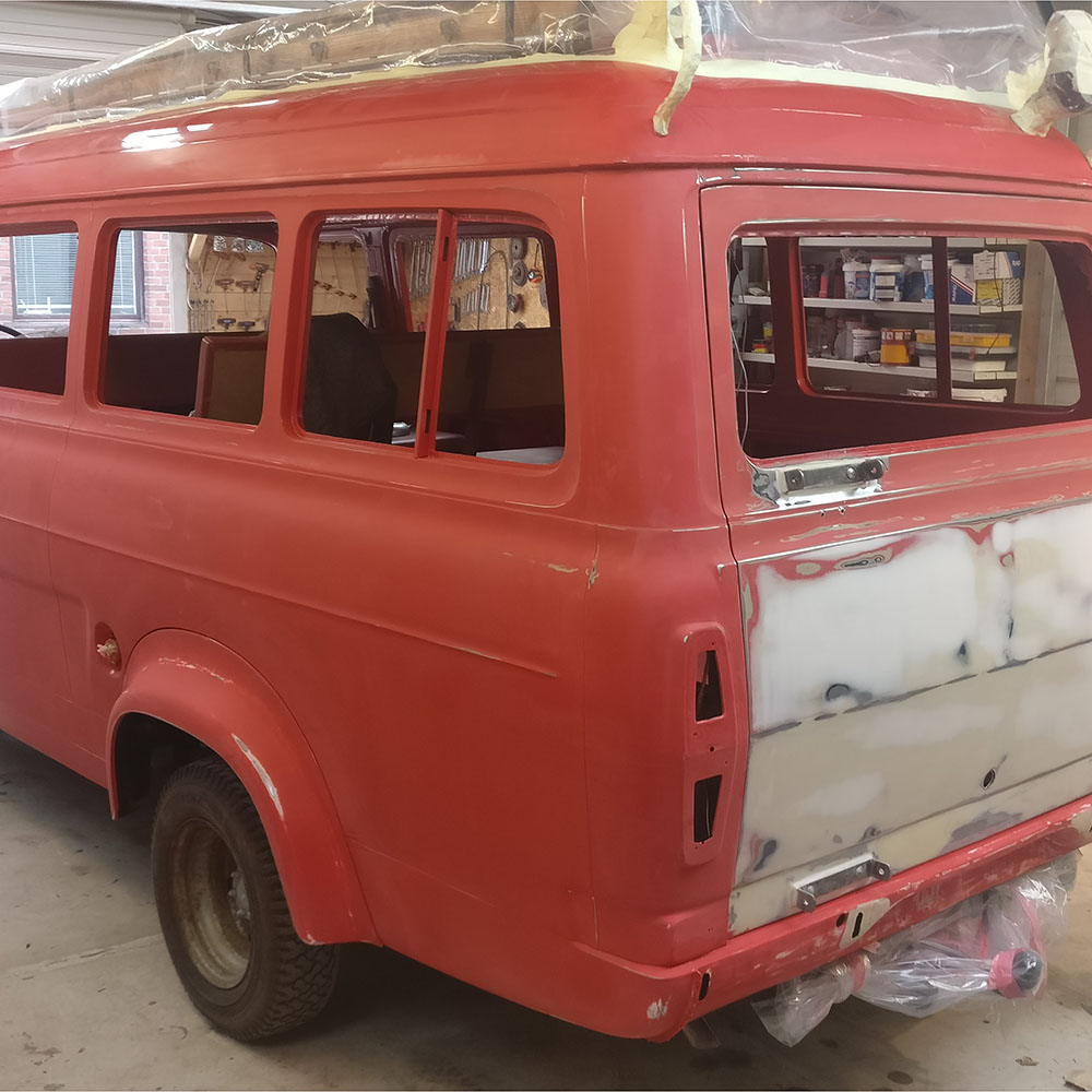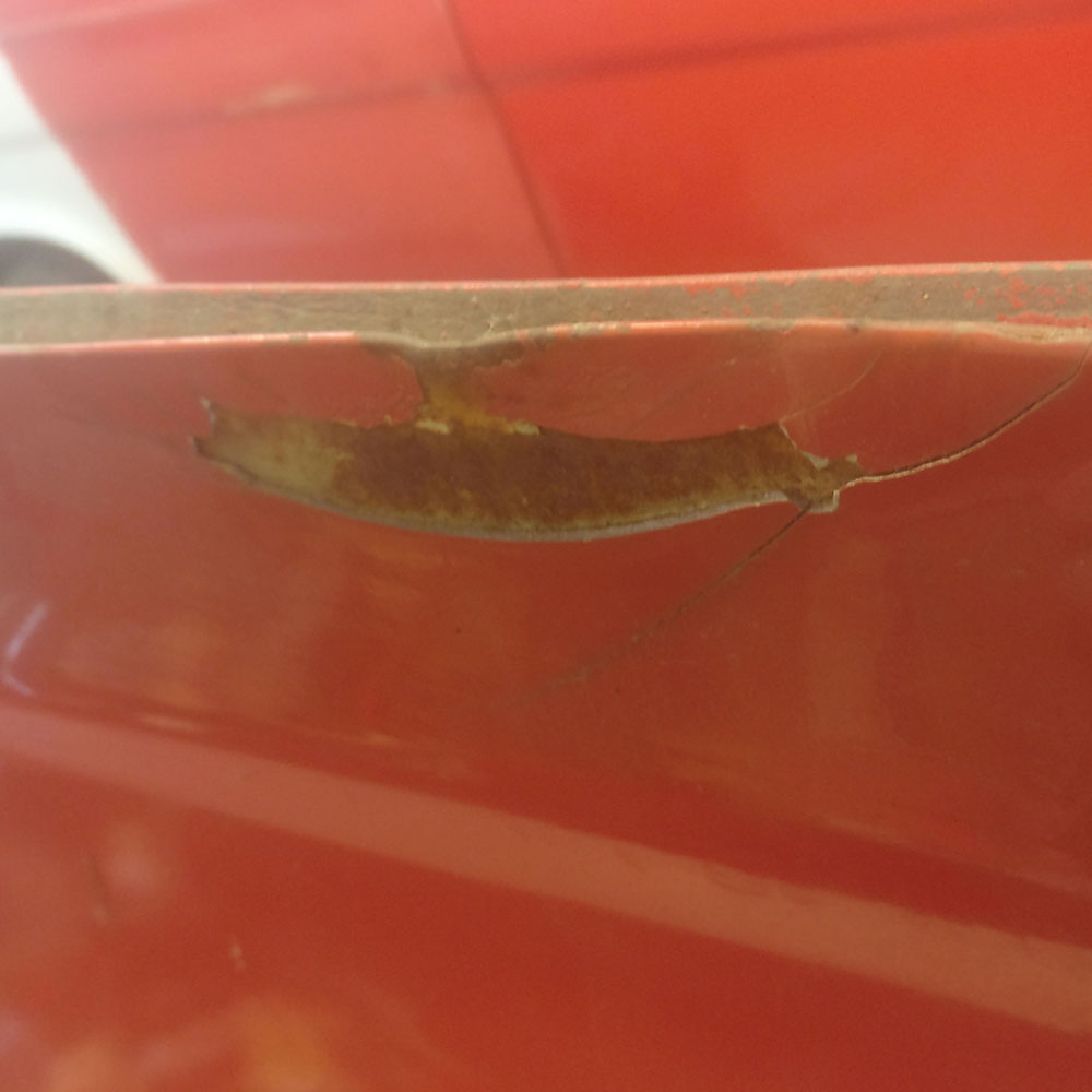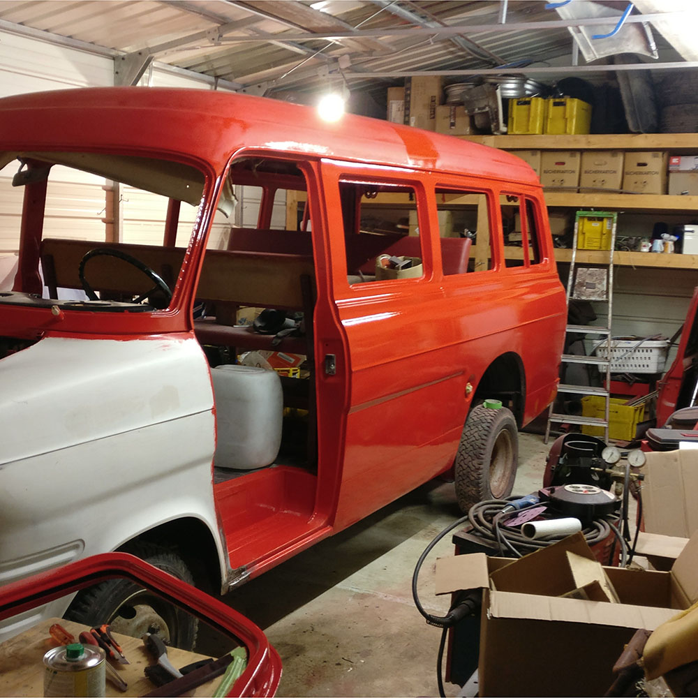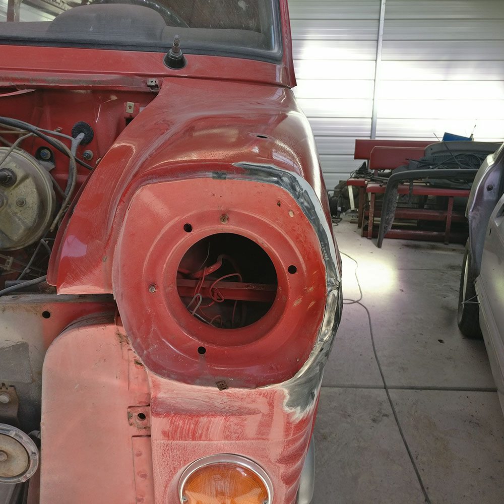 Am Ende haben wir dann wo nötig gespachtelt und mit 1200er Körnung durchgeschliffen, bevor das Auto zu Ali in die Lackiererei gekommen ist. Der hat dann den letzten Schliff gemacht und im original RAL 3000 „Feuerrot“ lackiert