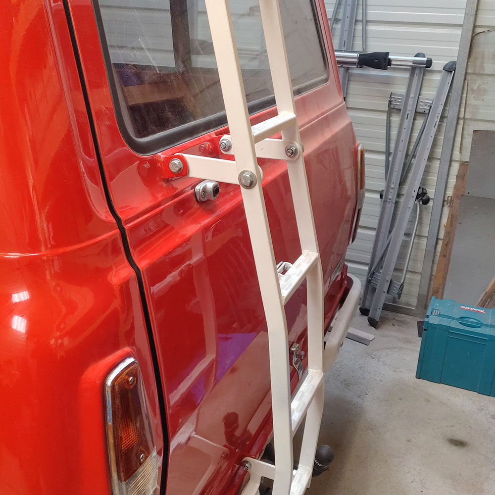 Die Heckklappe hat ein neues verzinktes Abschlußblech bekommen und wurde an den Aufnahmen für die Leiter massiv durch eingeschweißte Rohre und Flacheisen verstärkt.
