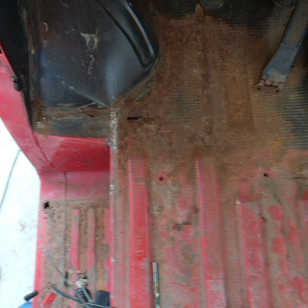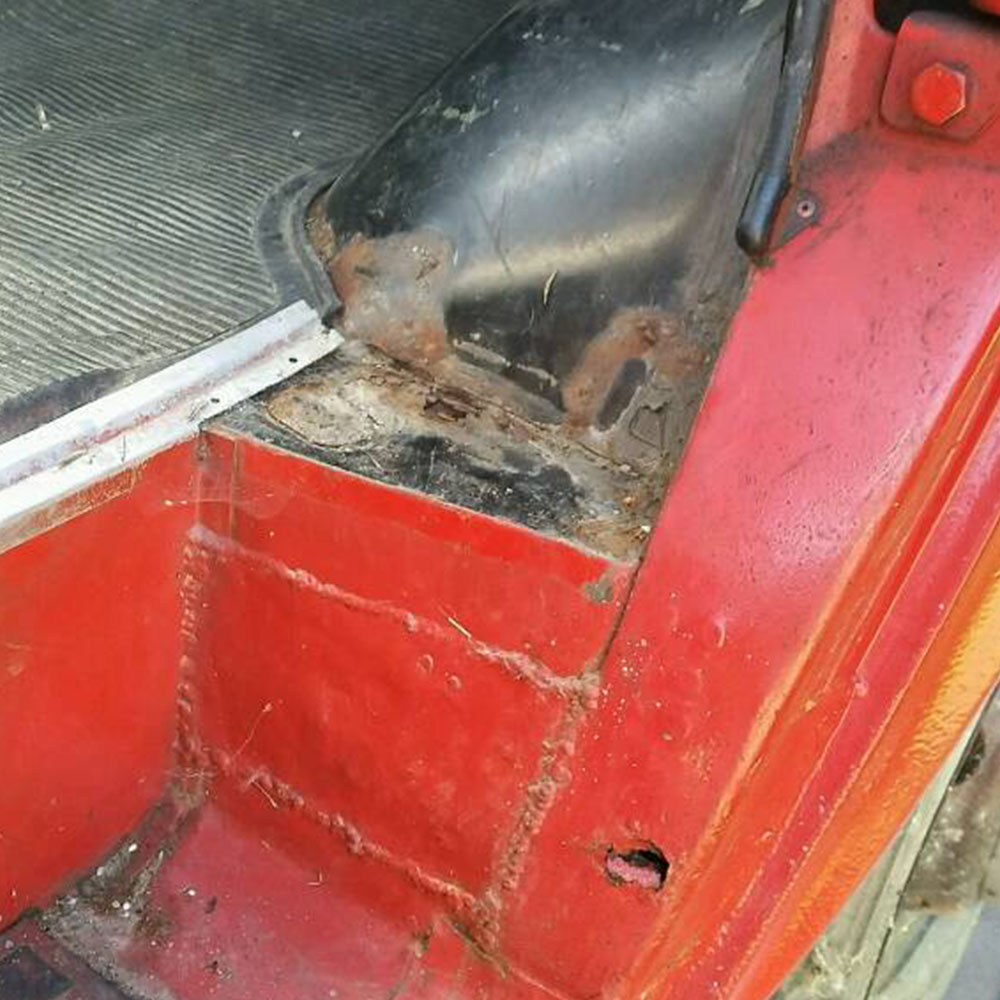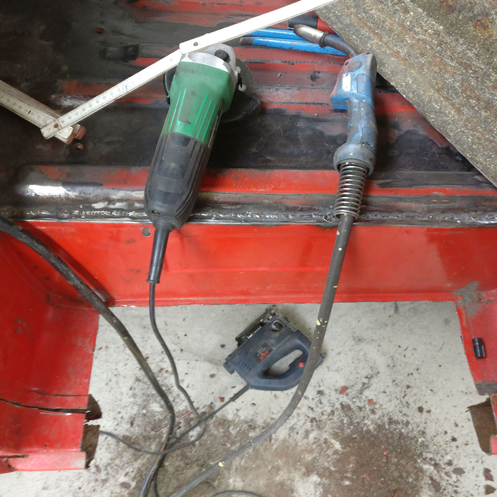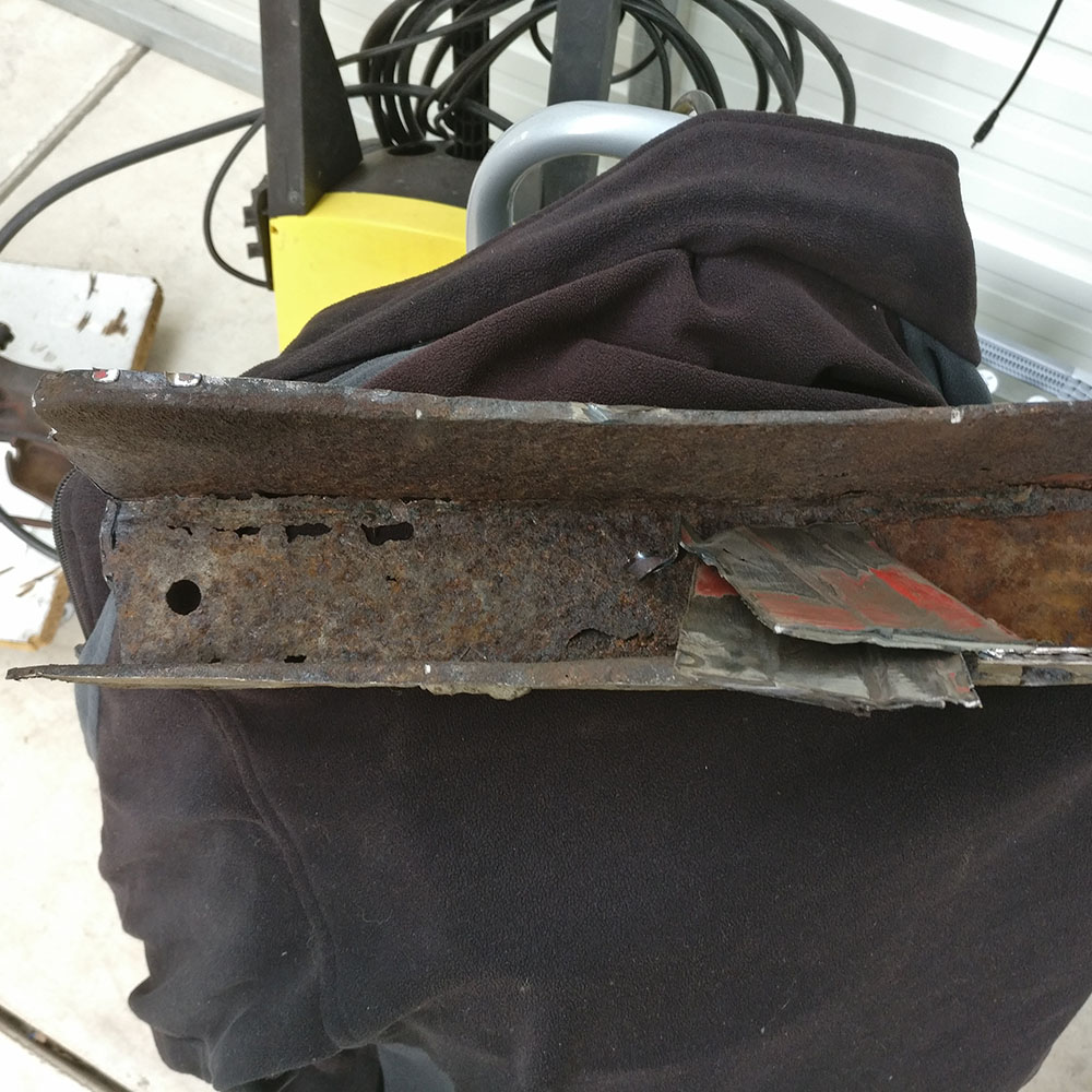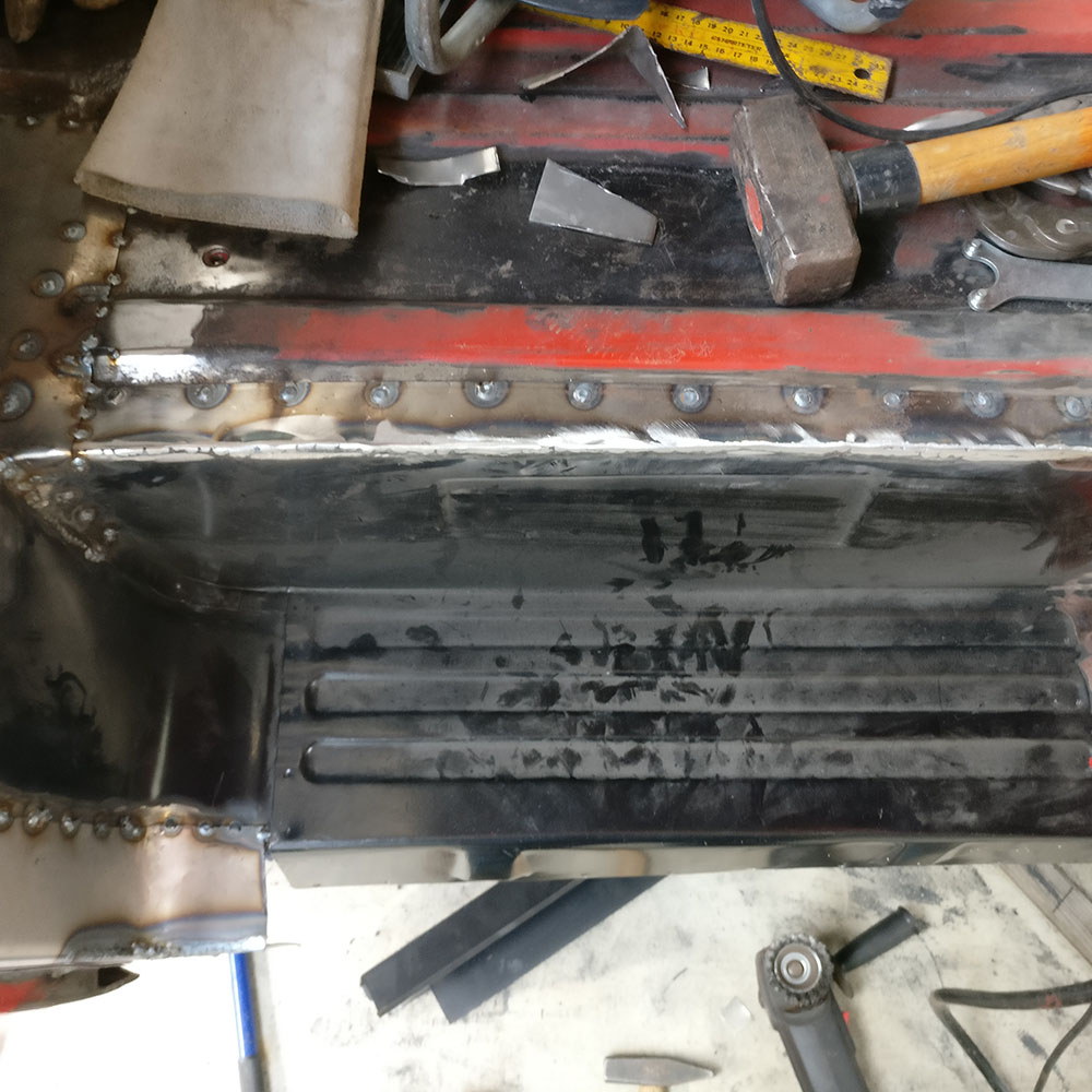 Die Einstiege wurden komplett geschweißt und durch Rep-Bleche ersetzt, und in den Holm hinten rechts ein Stück U-Träger eingesetzt. Alle Löcher wurden zugeschweißt.