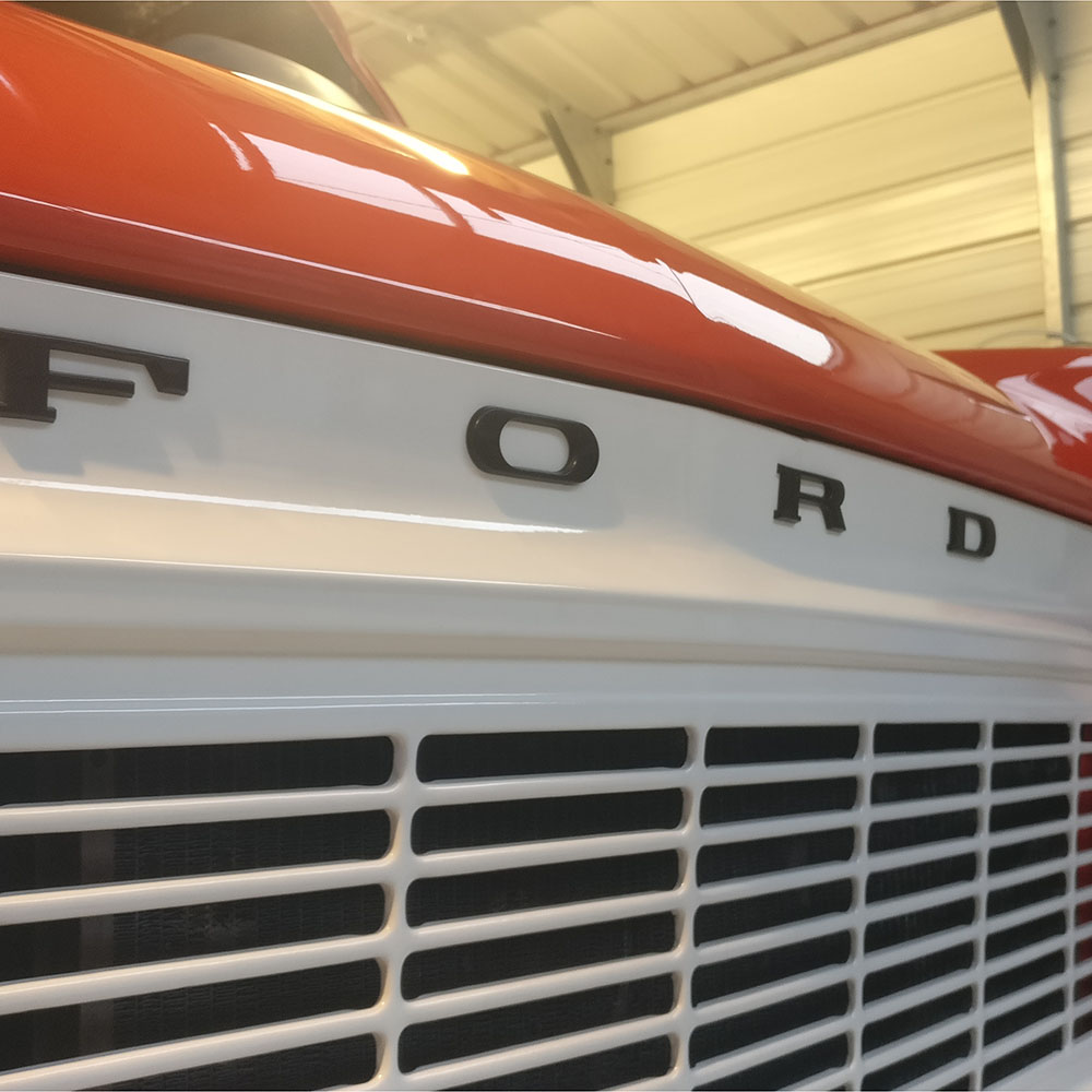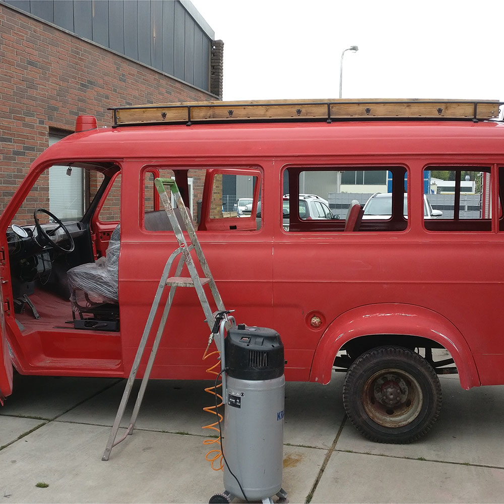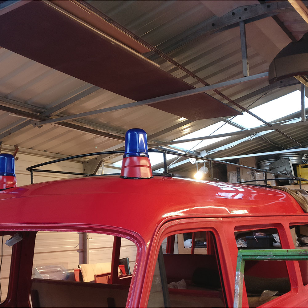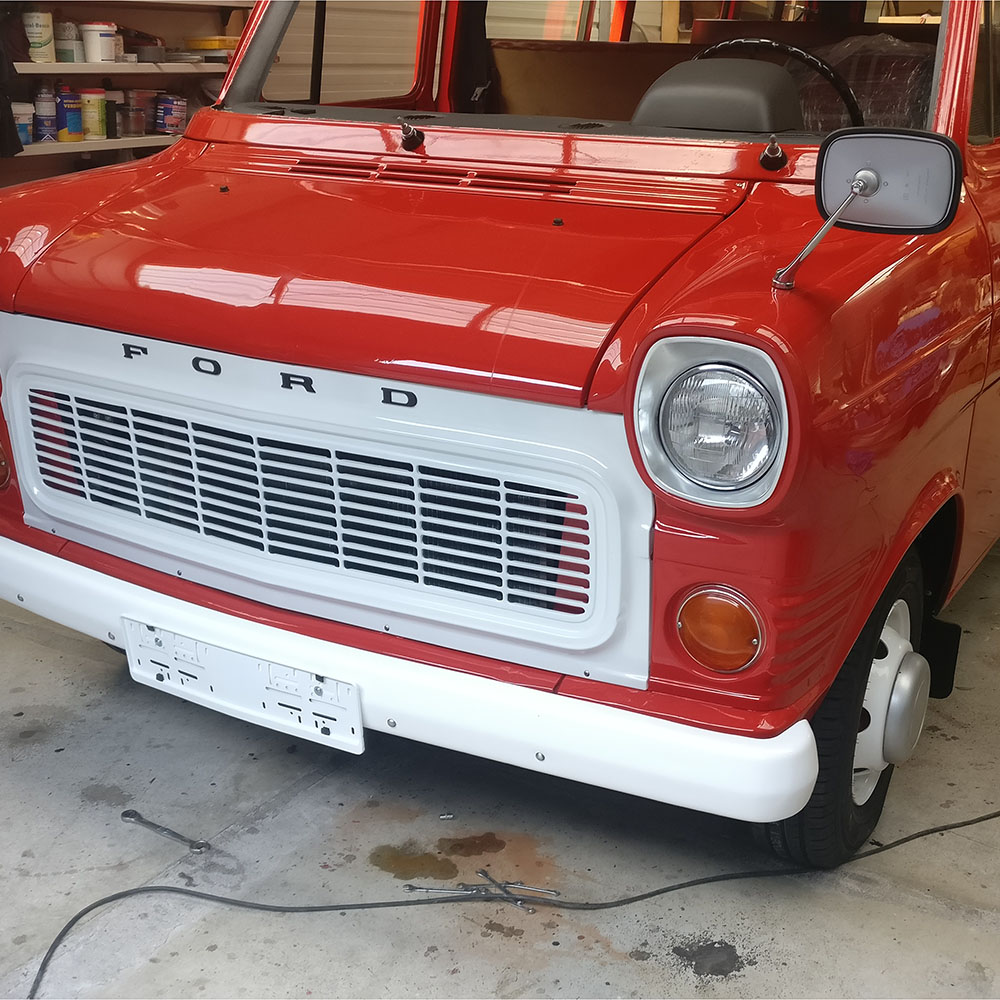 Die Felgen, Stoßstangen, die Leiter und das Kühlerblech wurden chemisch entlackt und pulverbeschichtet (verkehrsweiß).