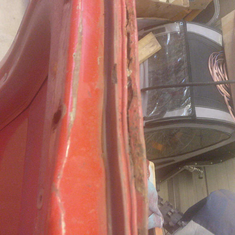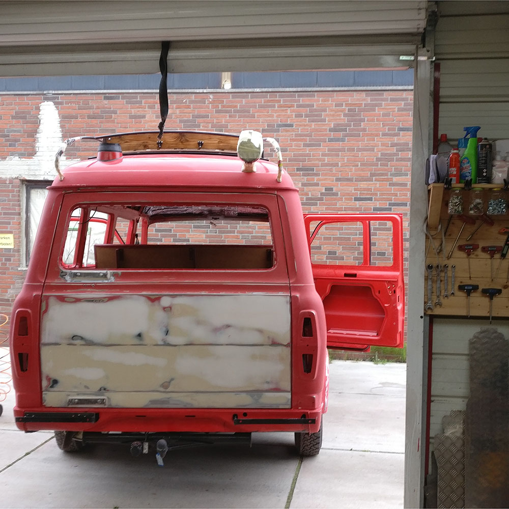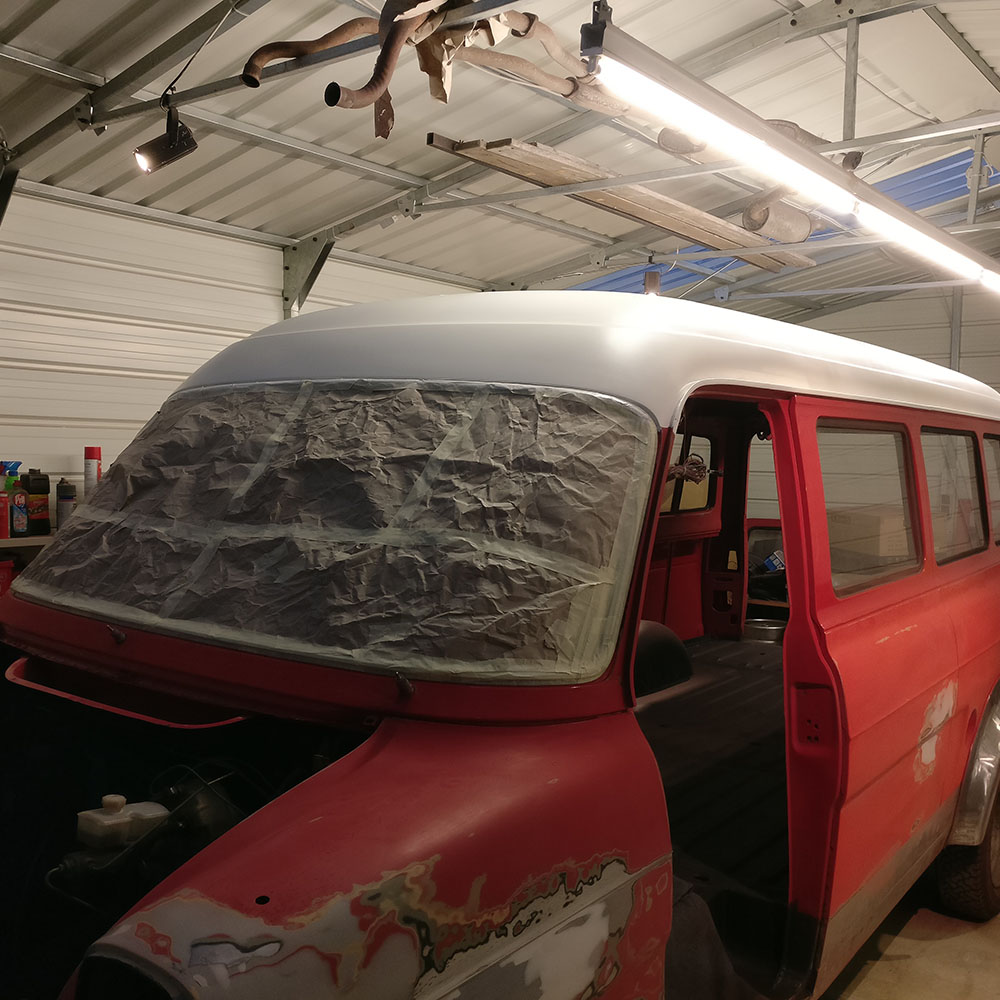 Den etwas instabilen Dachgepäckträger habe ich komplett entrostet und mit Brantho-Korrux gestrichen. Das Holz der aussenflächen habe ich abgeschliffen und mit Bootslack lackiert. Die Bodenleisten waren leider schon komplett morsch, daher habe ich sie durch stabile Siebdruckplatten wasserfest verleimt ersetzt. Zusammen mit den innen eingeschweißten Überollbügeln ist das Dach nun auch problemlos durch mehrere Personen zu begehen.