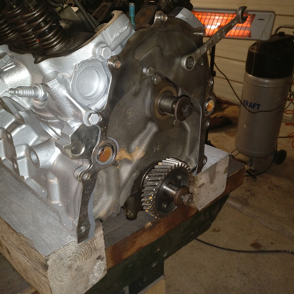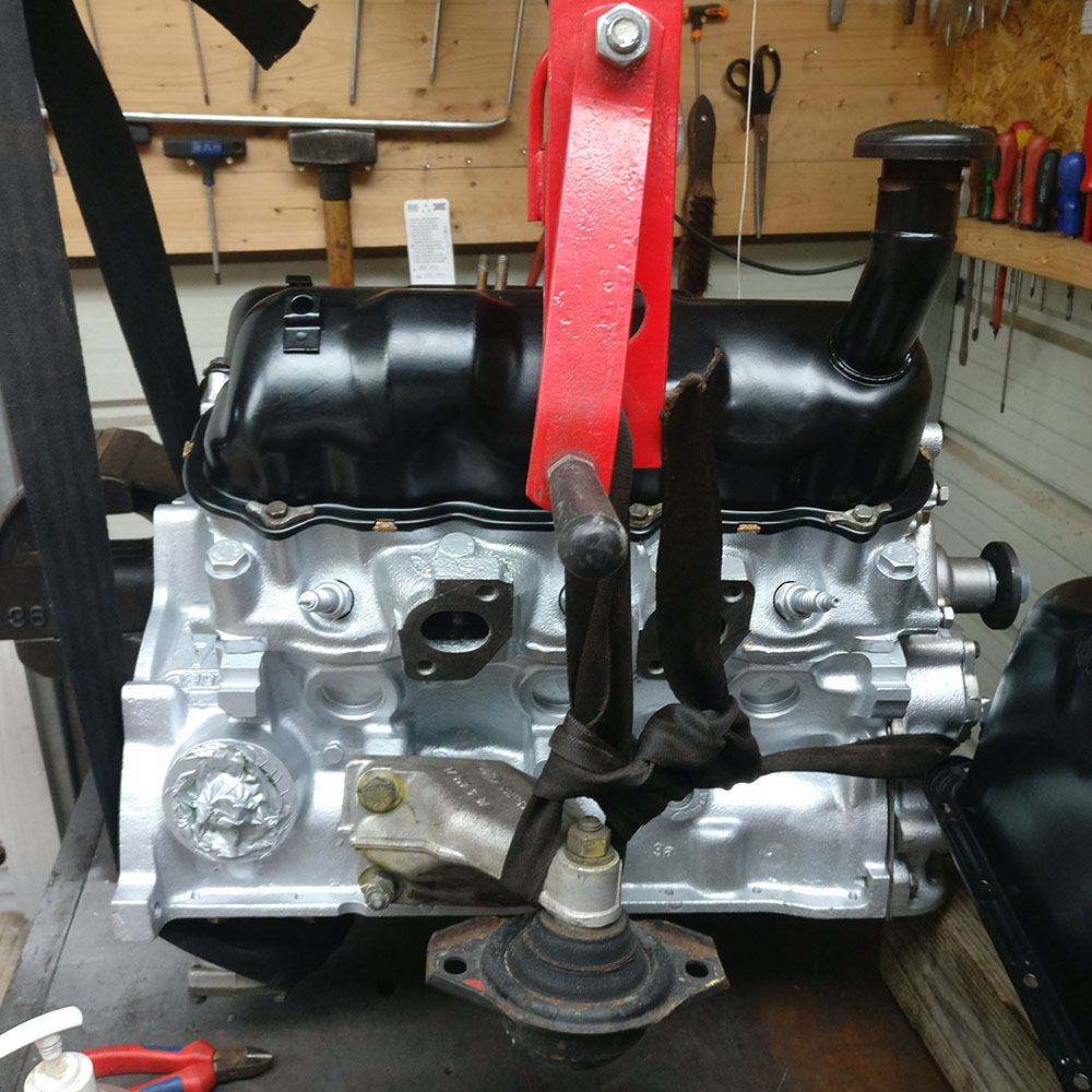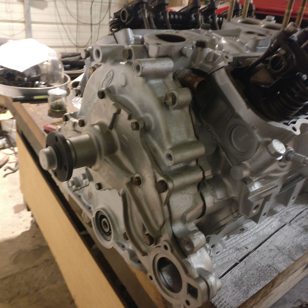 Alle Aggregate werden abgebaut, also Vergaser, LiMa, Verteiler (schon elektronisch), Krümmer, Sensoren, Kühlflansche, Kraftstoffpumpe, Wasserpumpe, Stirnräder Anlasser, wenn die nicht schon beim Ausbau aus dem Sierra abgenommen wurden.