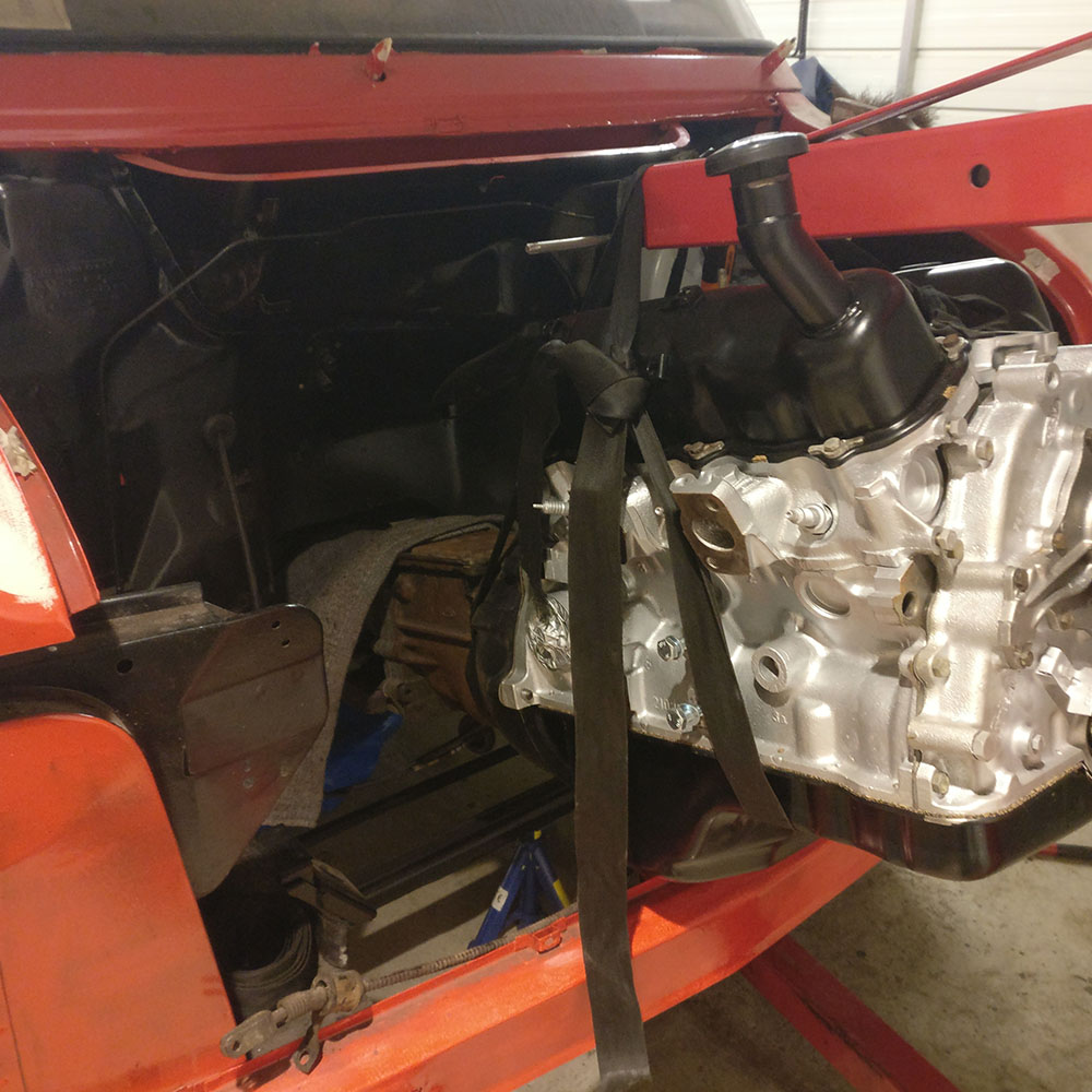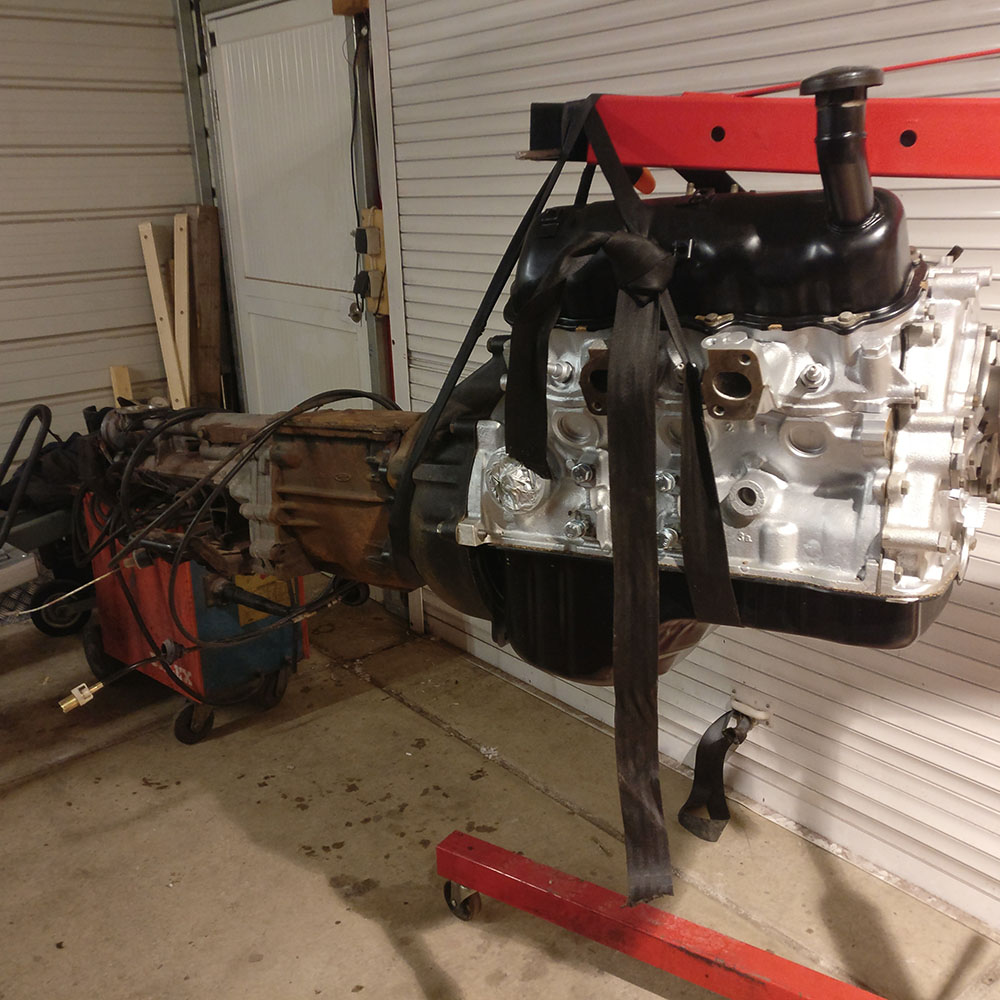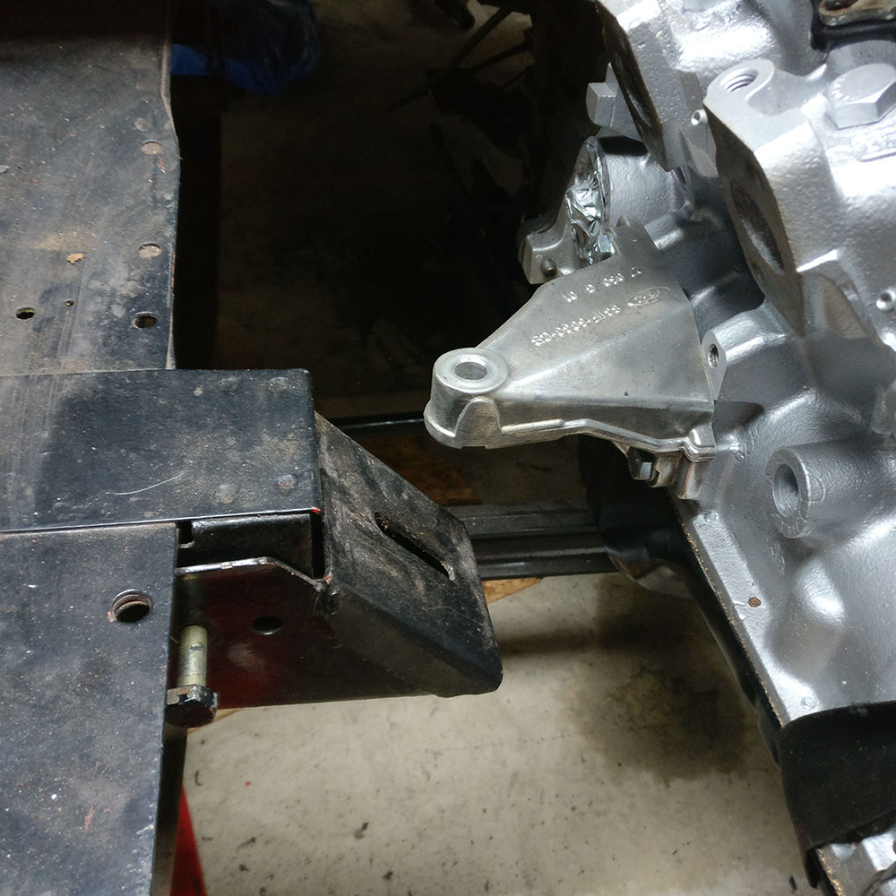 Nachdem die Motorhalter angepasst sind, ist es soweit, Motor und Getriebe werden wieder vereint und der Fisch anschließend vorsichtig in den Transit geschoben.