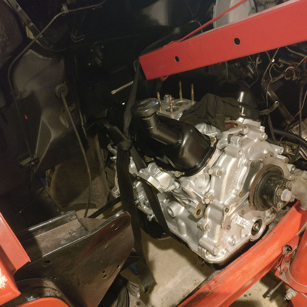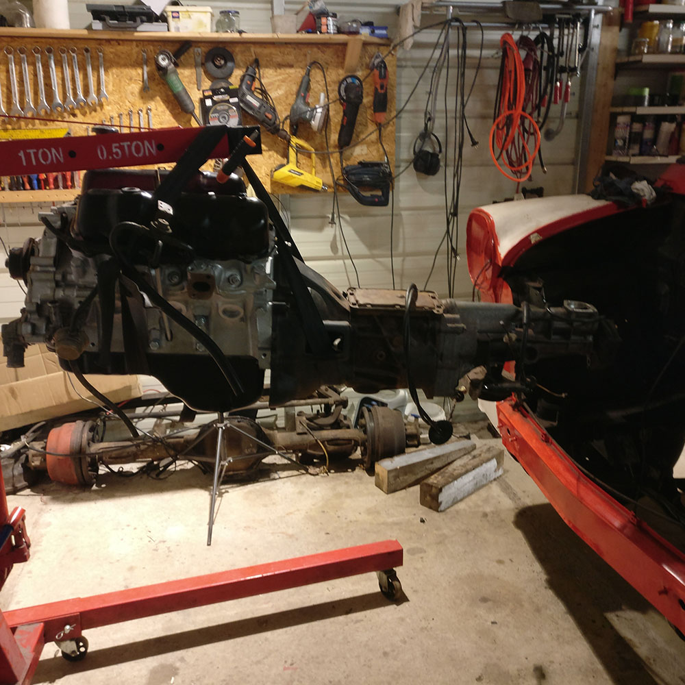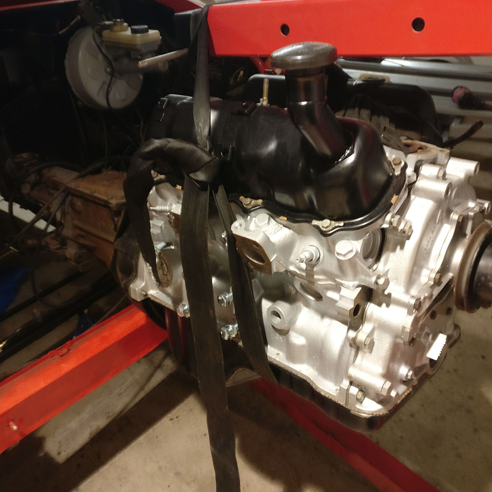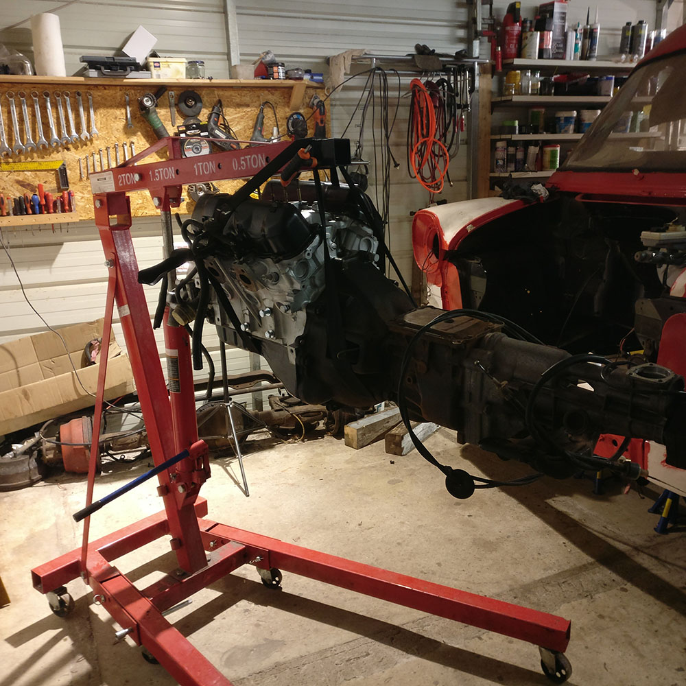 Nachdem die Motorhalter angepasst sind, ist es soweit, Motor und Getriebe werden wieder vereint und der Fisch anschließend vorsichtig in den Transit geschoben.