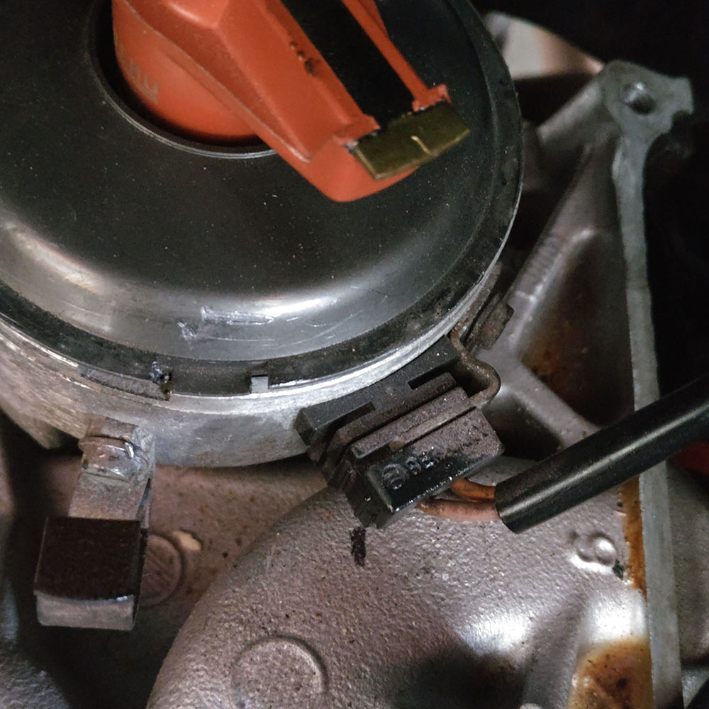 Der Verteiler hat einen neuen Finger und Kappe bekommen, alle Zündkabel und -kerzen wurden erneuert. Die Verteilerwelle hat kein Spiel.