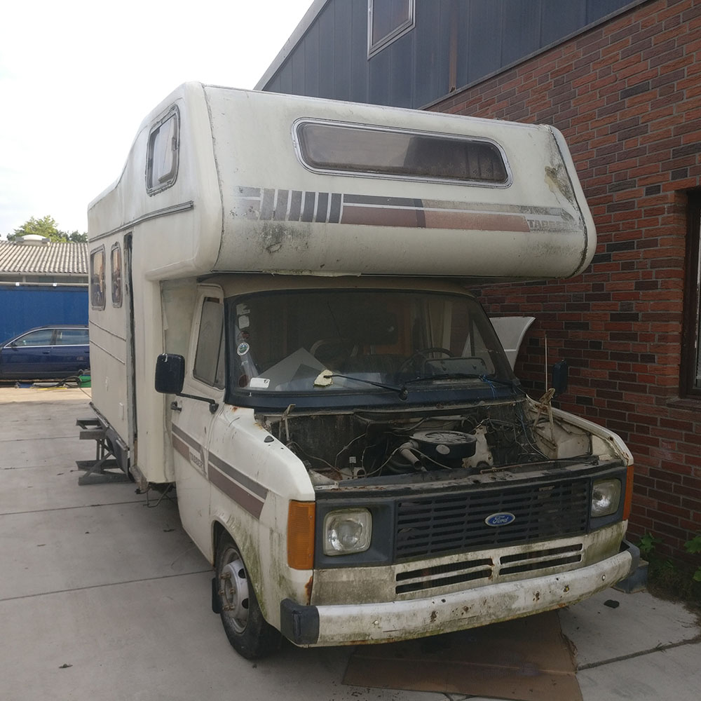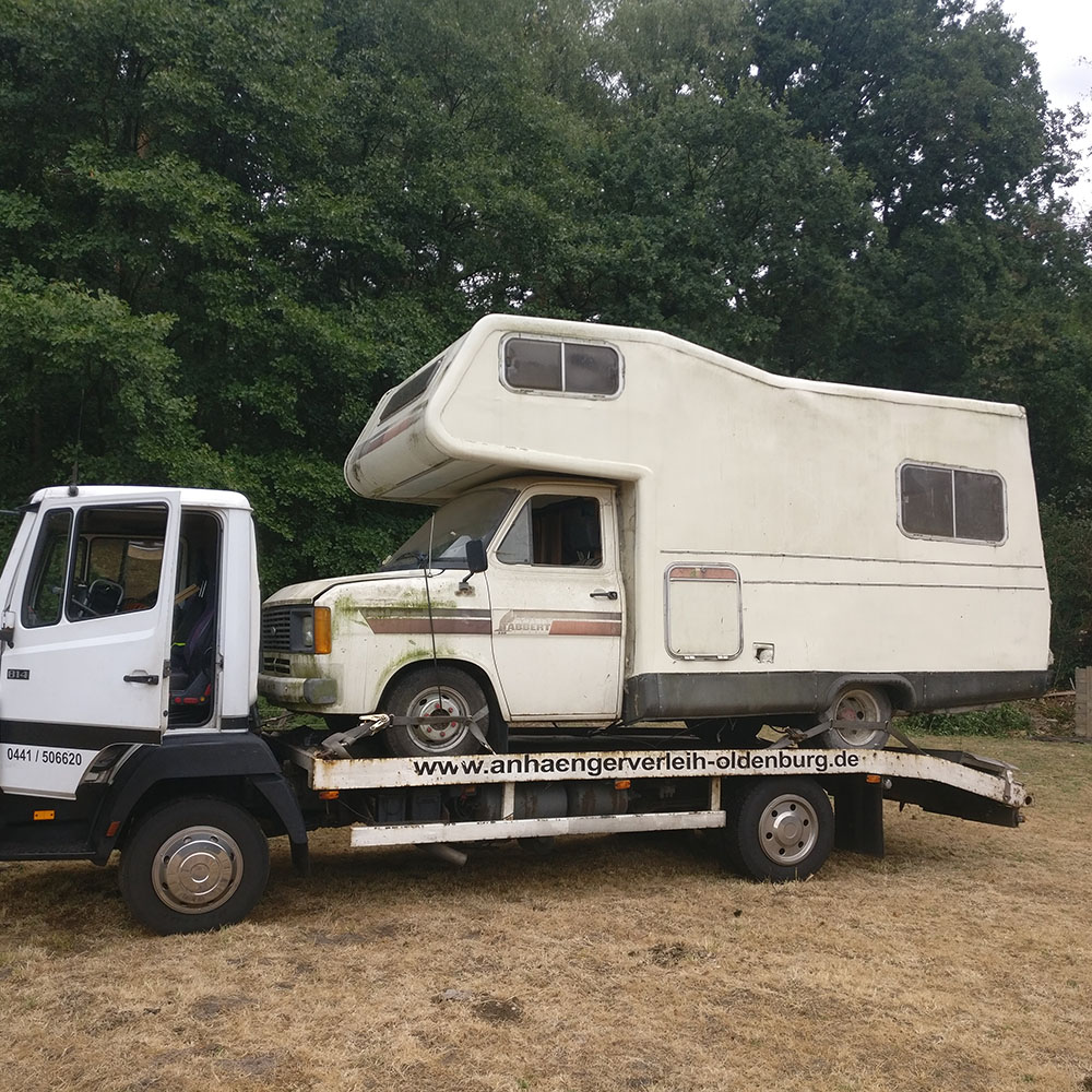 Also im Internet nach einem alten WoMo gesucht und gefunden. Für 500 € habe ich die Hütte hinter Münster abgeholt. Das war ein krasses Abenteuer, ich habe erst versucht, das wieder mit PKW und Hänger zu machen und den schnell abgebrochen.