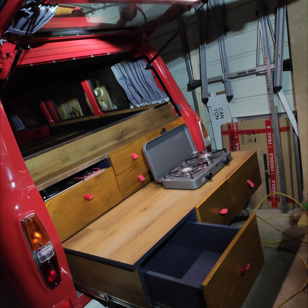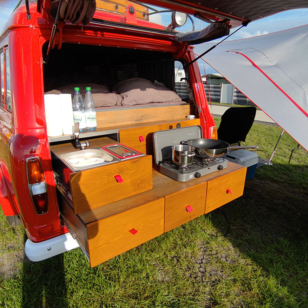 Im Heck des Johann ist ein ausziehbare Küche mit einer Einbauspüle mit elektrischen Wasserhahn, einem CADAC Zweiflammenkocher.