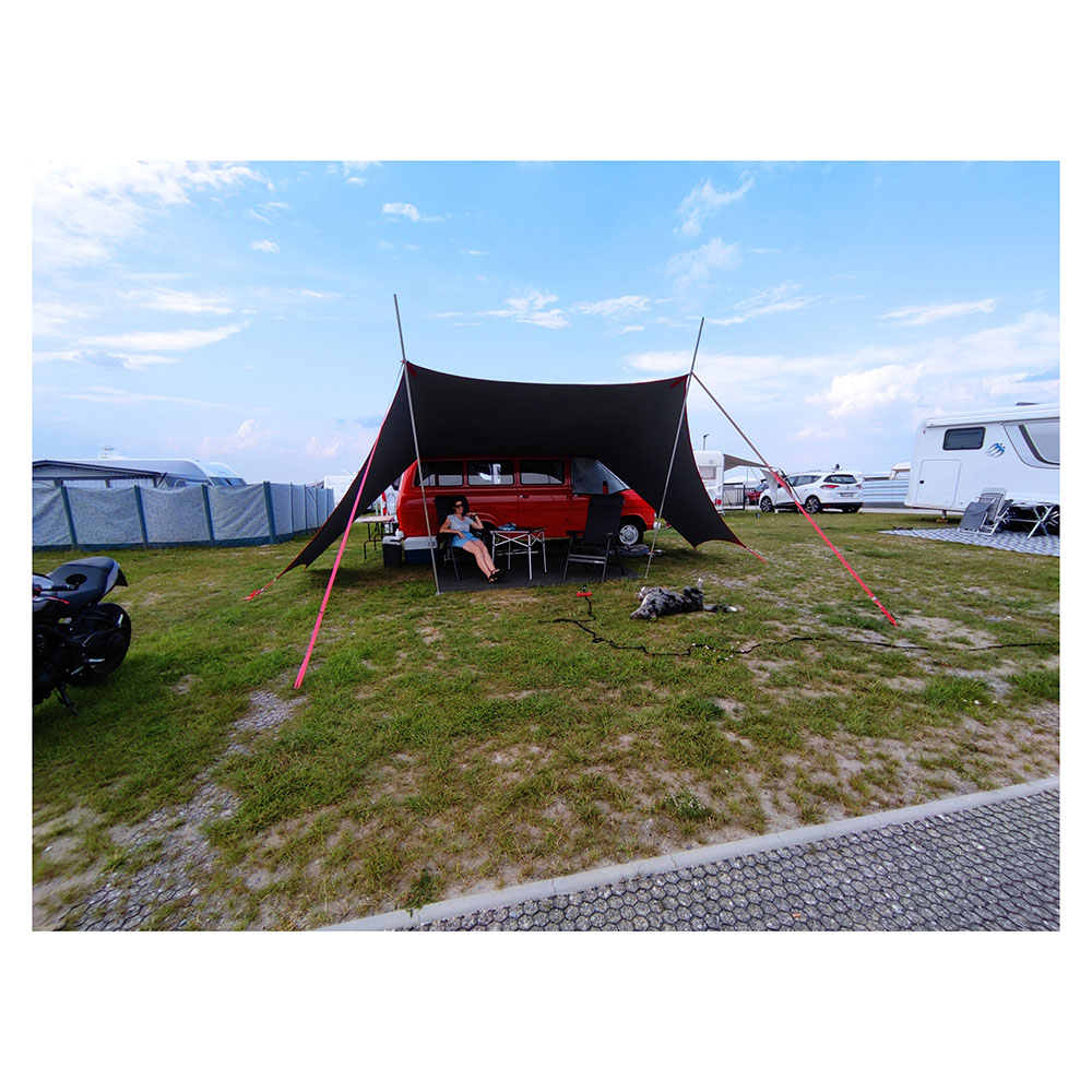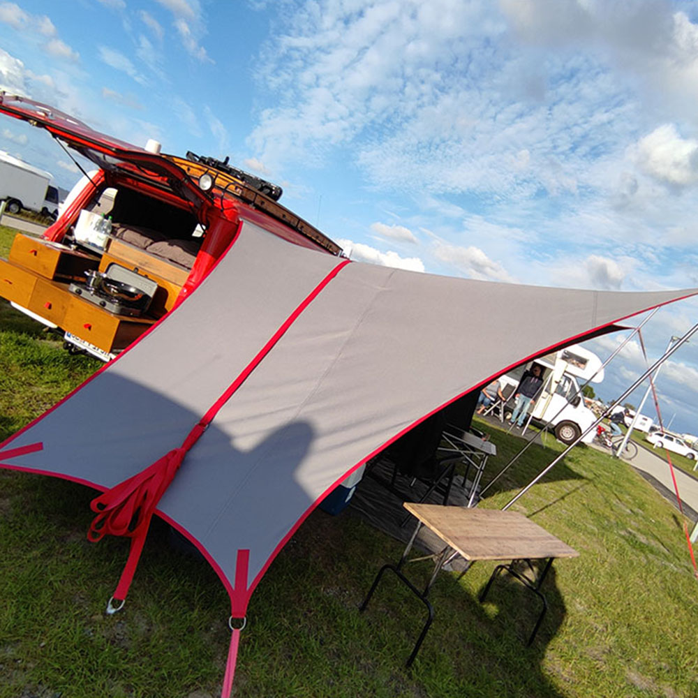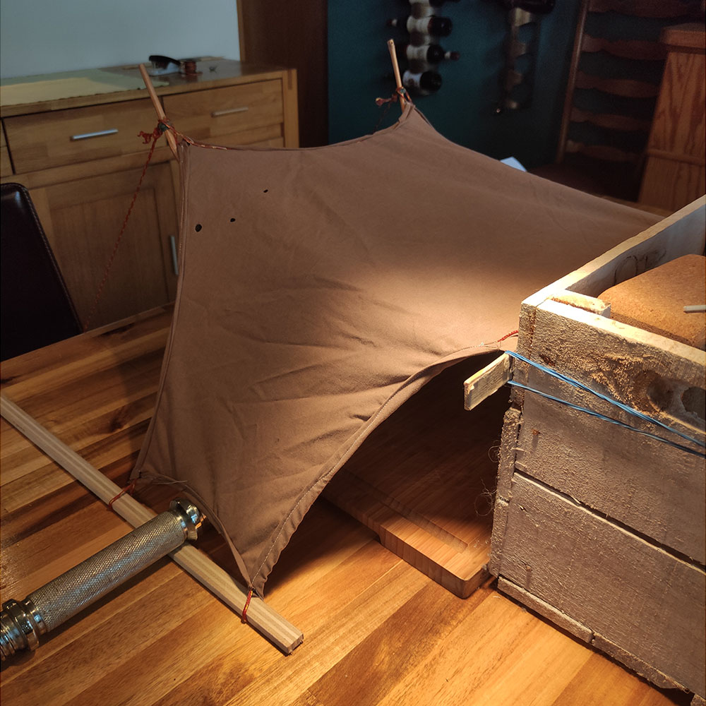 Der Stoff besteht aus 600er Oxford D und die Ränder sind in stabilem Gurtband gesäumt. Als Stangen habe ich massve Edelstahlrohre verwendet.