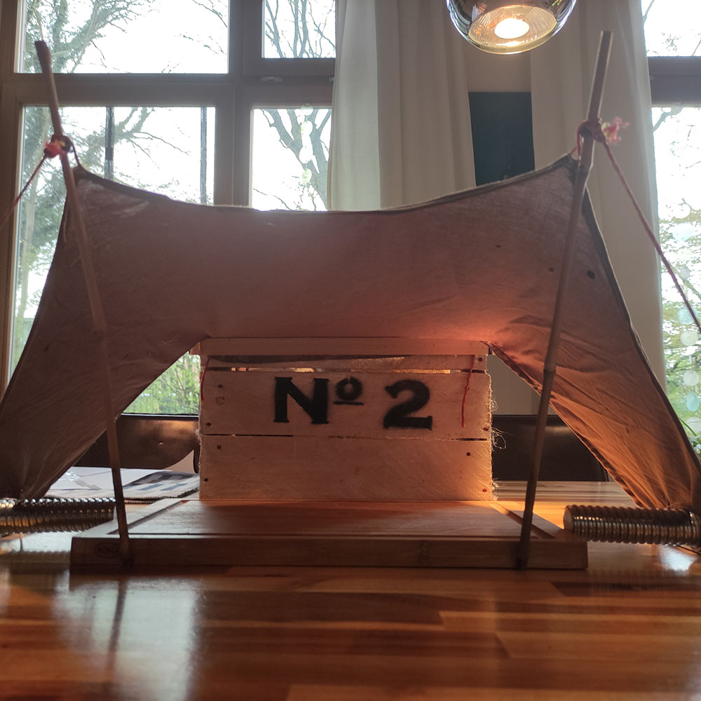 Als Vorlage für das Schnittmuster habe ich erstmal ein Modell 1 : 100 am Esstisch gebaut.