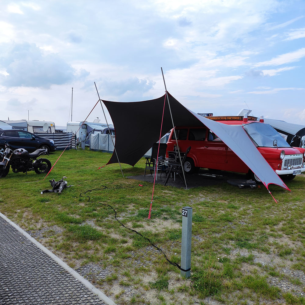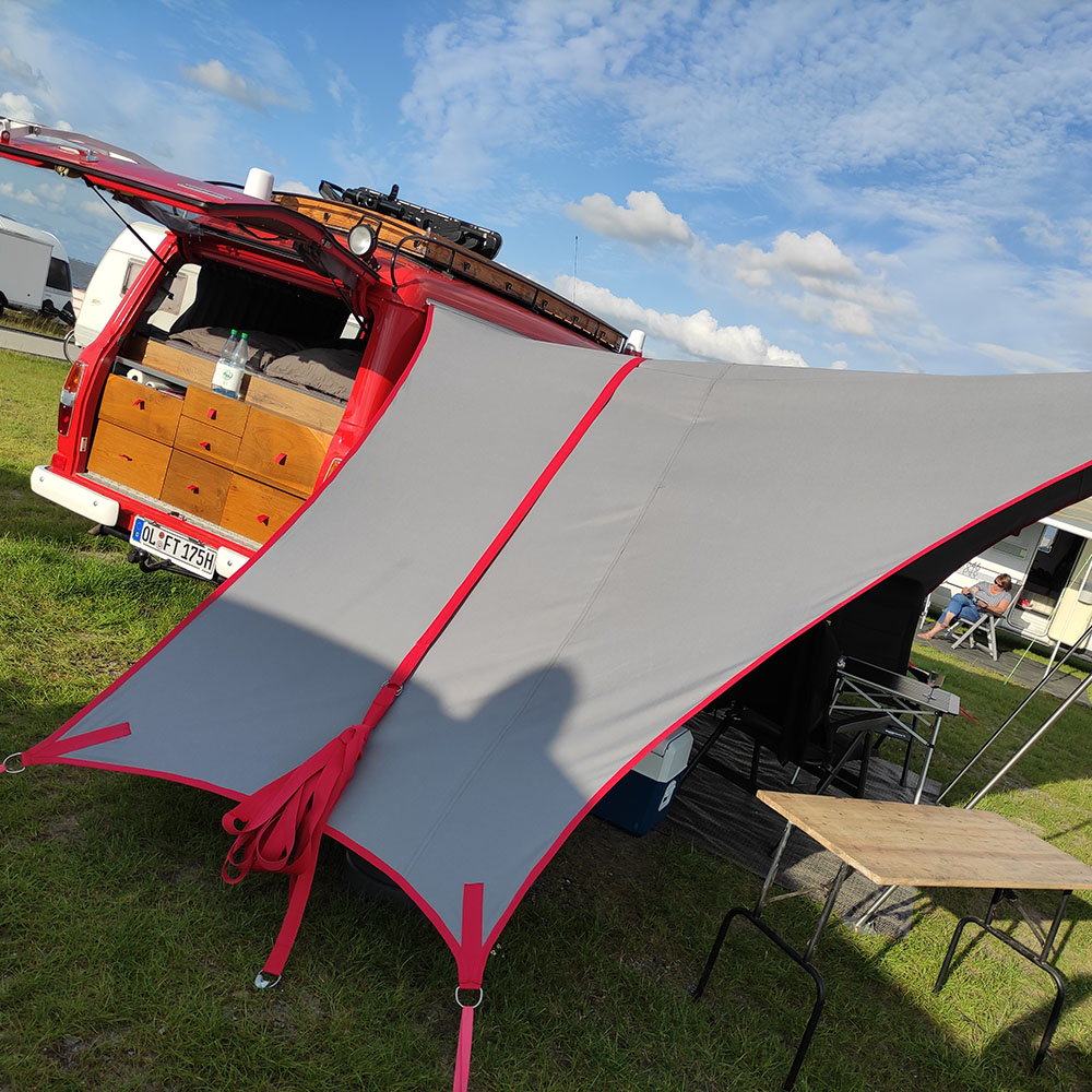 Zum einziartigen Auftritt vom Johan gehört auch sein selbst von uns genähtes Sonnensegel.