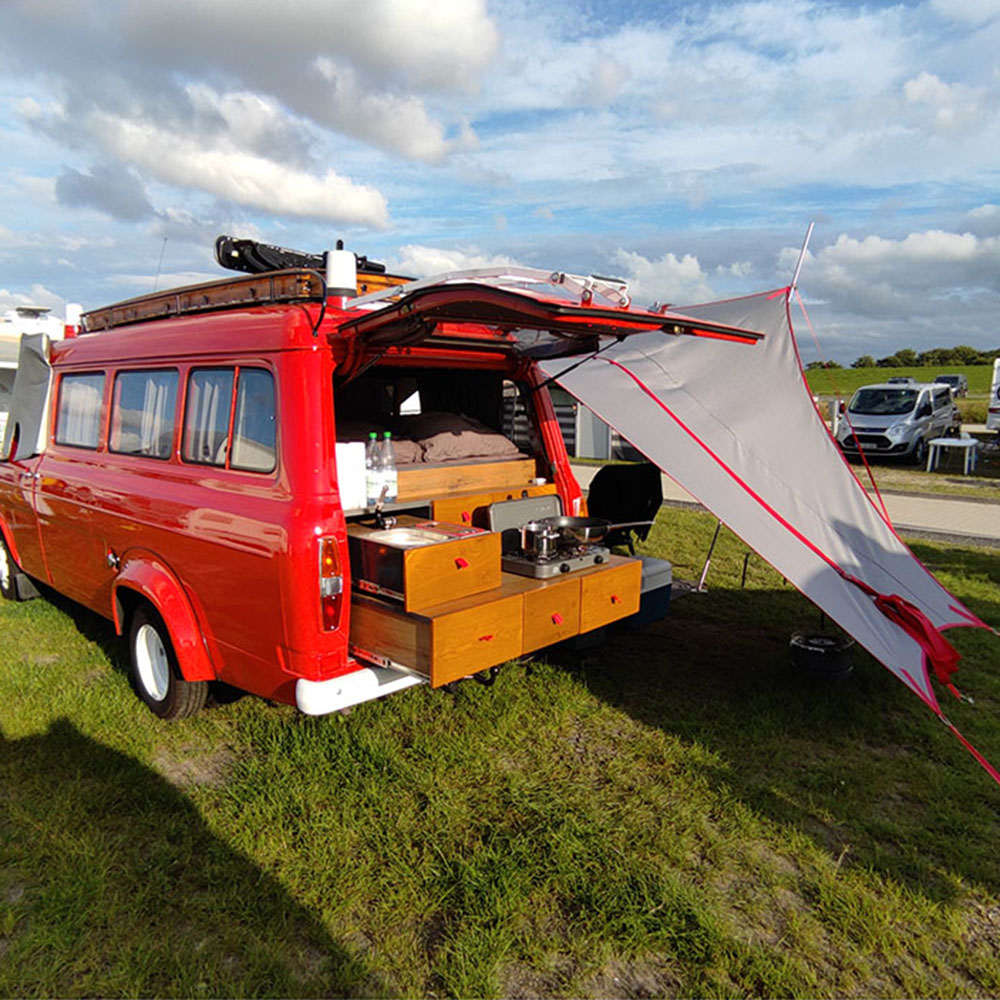 Über dem Küchenblock ist das aufklappbare, ,140 x 2,00 m große Bett eingebaut. Dieses lässt sich im Innenraum hochklappen, im darunterliegenden Stauraum finden sich der Frischwassertank, Stühle, Tische, Sonnensegel, Grill u.s.w.